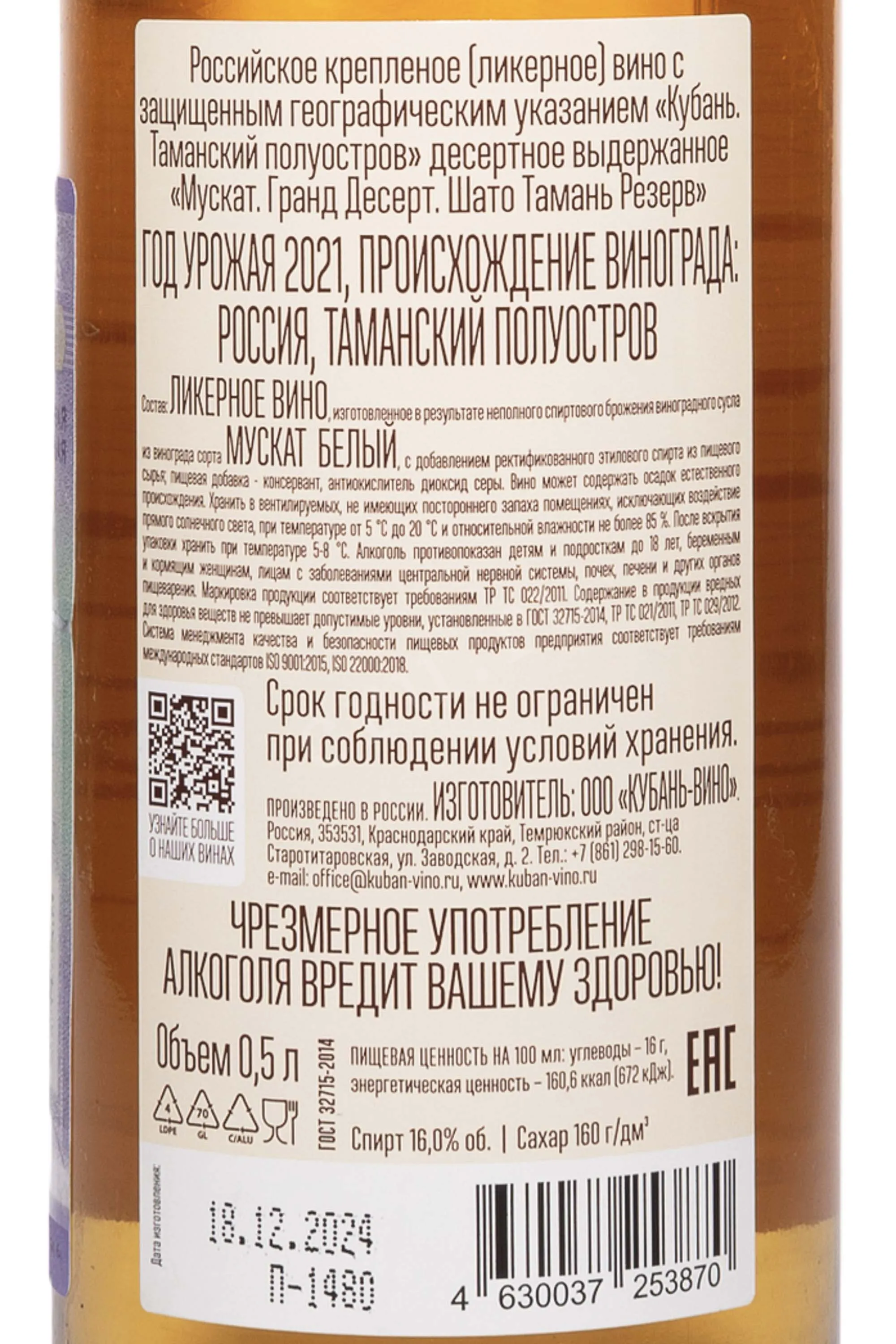 Белое сладкое вино Шато Тамань Гранд Десерт Мускат Резерв 2021 года 0,75 л — выдержанное, гармоничное и яркое. Виноград сорта Мускат выращен на собственных виноградниках агрофирмы «Южная», расположенных в Таманском терруаре Краснодарского края. Средний возраст лоз — около 13 лет. 2021 год отличался тёплой и сухой погодой, что позволило ягодам накопить высокий уровень сахара и ароматических веществ. После сбора виноград подвергали мягкому прессованию, сусло настаивалось на мезге для усиления вкуса и аромата, затем ферментировалось. Процесс брожения останавливался добавлением этилового ректификованного спирта, что сохраняло естественную сладость. Выдержка в бочках из кавказского дуба длилась не менее 18 месяцев. Благодаря этому вино приобрело сложный букет и гармонию вкуса. За своё качество Grand Dessert Muscat получил золотую медаль на конкурсе Muvina (Словакия), бронзу на International Wine & Spirit Competition (Лондон) и золото на Chisinau Wine & Spirit Contest (Молдавия).