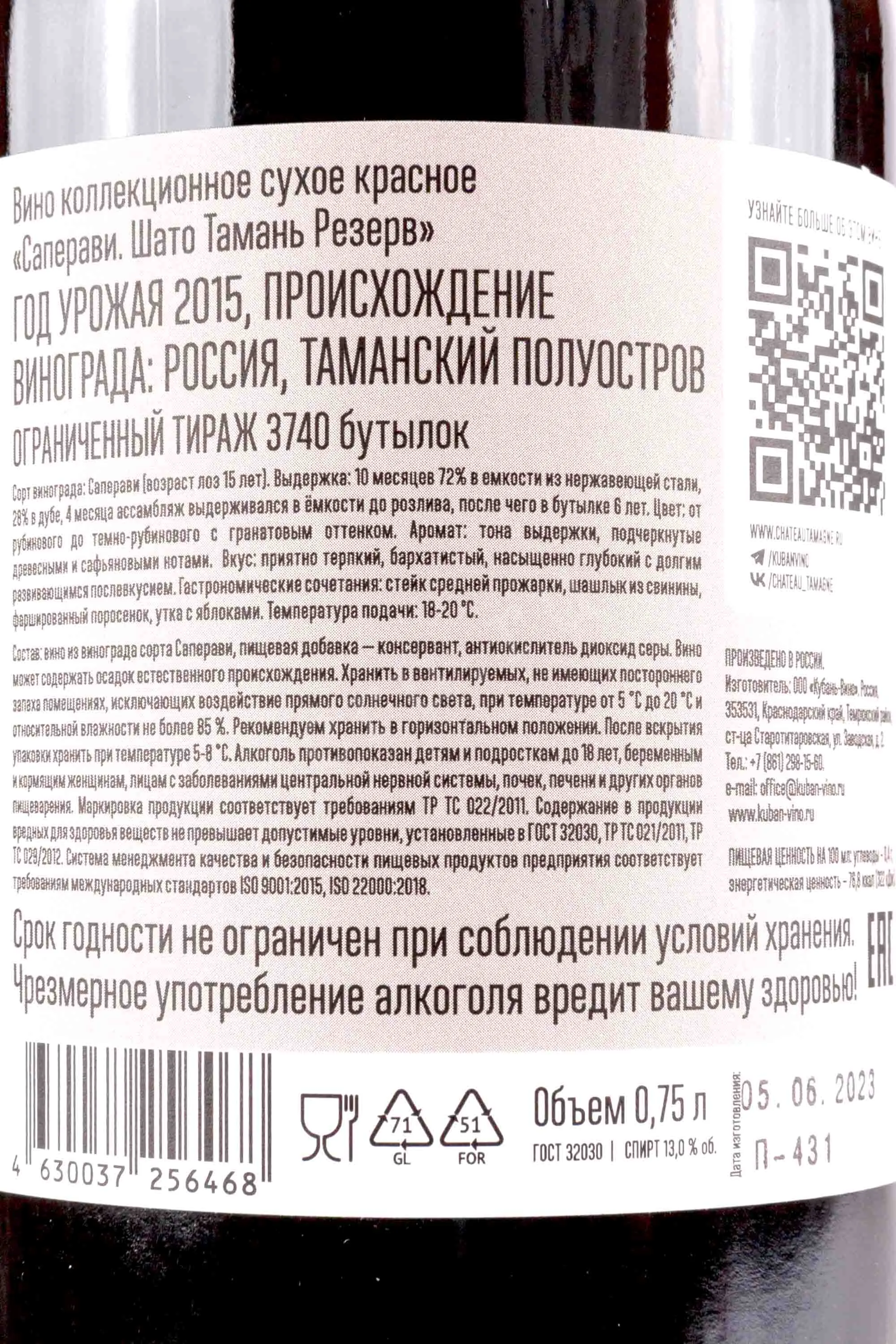 Вино Шато Тамань Резерв Саперави Лимитированный выпуск 0,75 л создано на основе урожая, собранного на обширных виноградниках винодельни Кубань-Вино, чей терруар простирается более чем на сто тысяч гектаров. Почвы здесь сложены из чернозёма, песчано-известковых слоёв и минерализованных отложений, что позволяет Саперави накапливать плотный природный пигмент и формировать характерную пряность. Ограниченный выпуск (3740 бутылок) предполагает тщательную работу с каждой партией: длительное взаимодействие вина с дубом, применение бочек разного уровня обжига, выдержка свыше 12 лет и последующая полугодовая довыдержка в бутылке.
