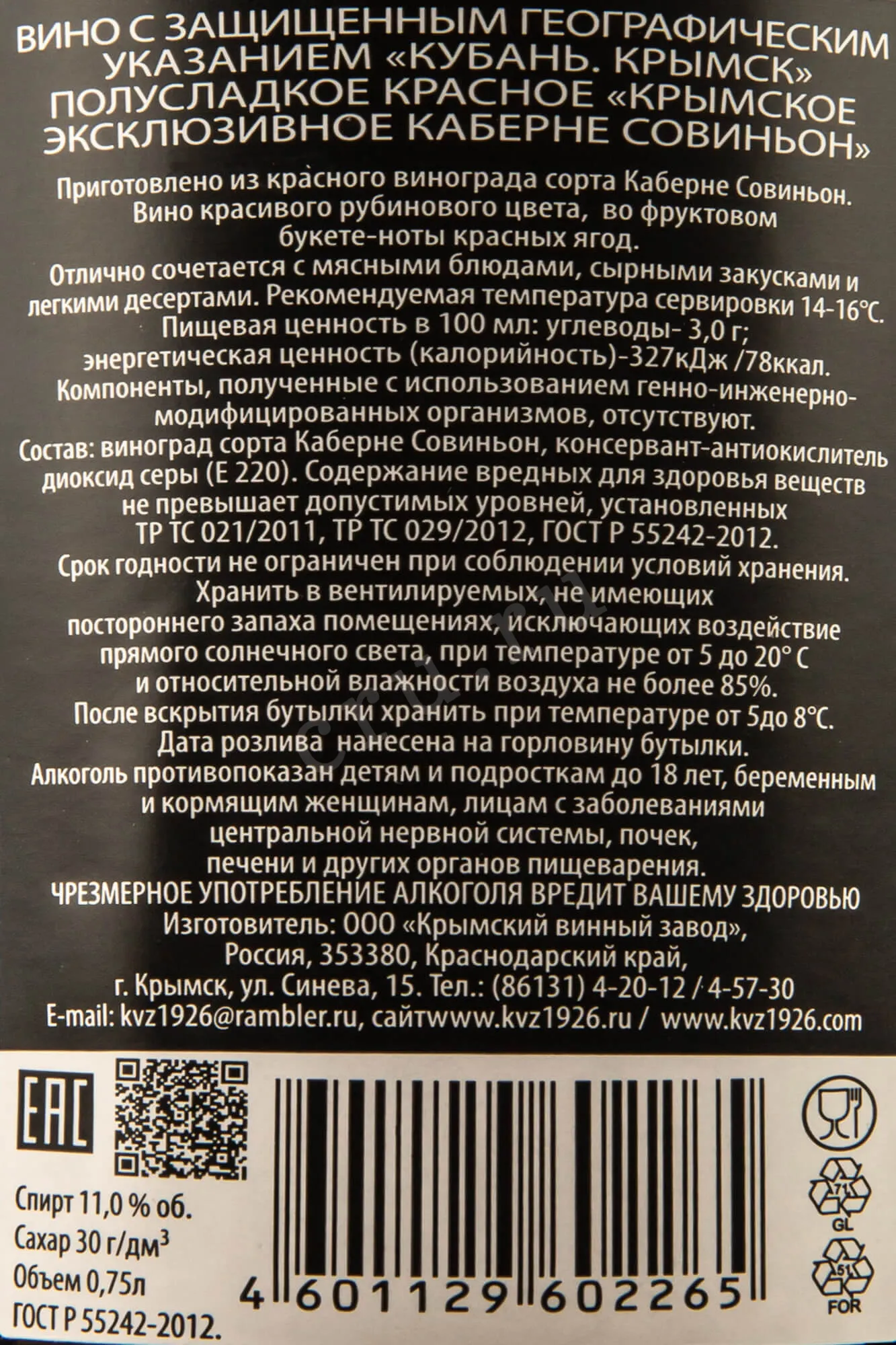 Красное полусладкое вино Crimean Exclusive 2019 0.75 l – это моносортовой российский алкоголь из особой серии, выпущенной Крымским винным заводом. Напиток защищенного географического наименования создан из винограда урожая одного года. Ягоды были собраны ручным способом с лоз, средний возраст которых 6 лет. Тихое вино изготовлено методом традиционной винификации. Готовый алкоголь имеет крепость 11%, а содержание сахара составляет 30 г/л.
