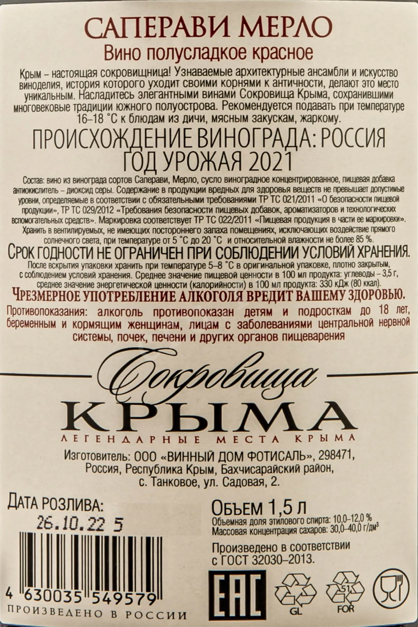 Сокровища Крыма Саперави Мерло Фотисаль 2021 1.5 л купить - Российское вино Crimean Treasures Saperavi Merlot Fotisal цена в магазине КРЮ ПРОФИ г. Москва, ул. Профсоюзная, д. 16/10 10:00-22:00 Ежедневно +7 (495) 920-20-02 info@cru.ru