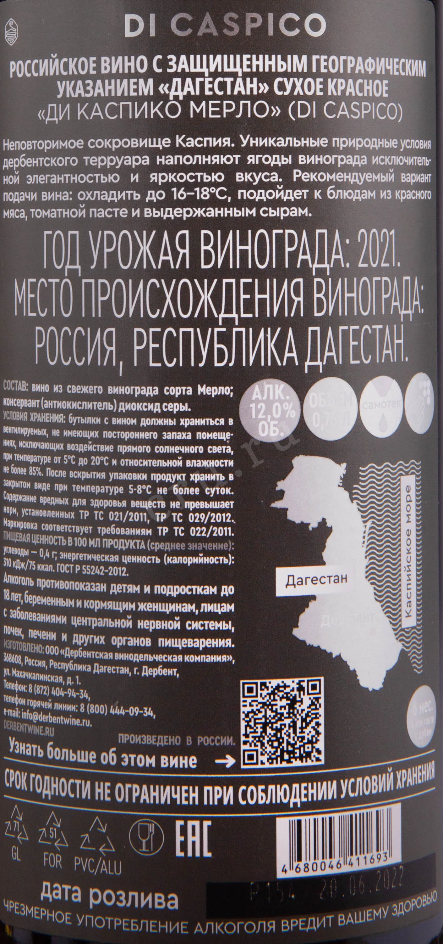 Вино Ди Каспико Мерло 0,75 л. создано на юге Дагестана хозяйством «Дербент-Вино», чьи виноградники раскинулись у самого побережья Каспийского моря. Мягкий морской бриз, продолжительное солнечное лето и известково-каменистые почвы формируют выразительный терруар, способствующий равномерному вызреванию ягод. Урожай собирают в фазе оптимальной фенольной спелости, после чего проводится бережное дробление и контролируемая ферментация при стабильной температуре для сохранения сортового характера. Часть партии выдерживается в контакте с дубом, что придаёт структуре глубину и подчёркивает природную насыщенность напитка.