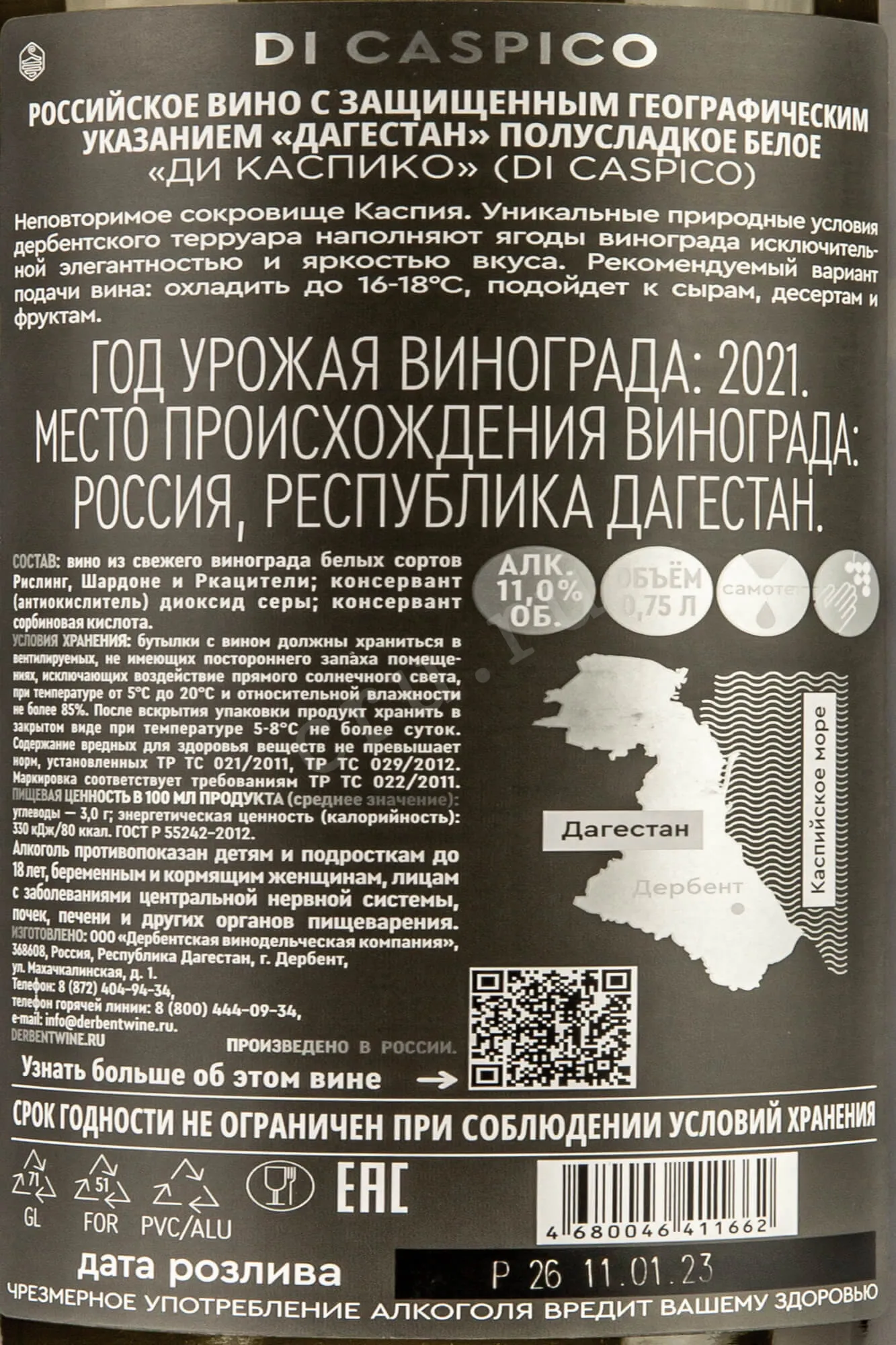 Вино Ди Каспико полусладкое 0,75 л — белое полусладкое спиртное, созданное Дербентским винным комбинатом, чьи виноградники раскинулись у подножия древней крепости Нарын-Кала, неподалёку от побережья Каспийского моря. Мягкий морской климат с обилием солнечных дней и прохладными ночами способствует равномерному накоплению сахаров и сохранению естественной кислотности ягод. Урожай собирают в период оптимальной зрелости, после чего проводится деликатное прессование и ферментация при контролируемой температуре, позволяющей сохранить чистоту сортового аромата. Часть сусла охлаждают для остановки брожения, что помогает сохранить природную сладость и гармоничный баланс. Напиток отличается светло-соломенным оттенком с золотистыми отблесками, выразительной ароматикой и мягкой текстурой.