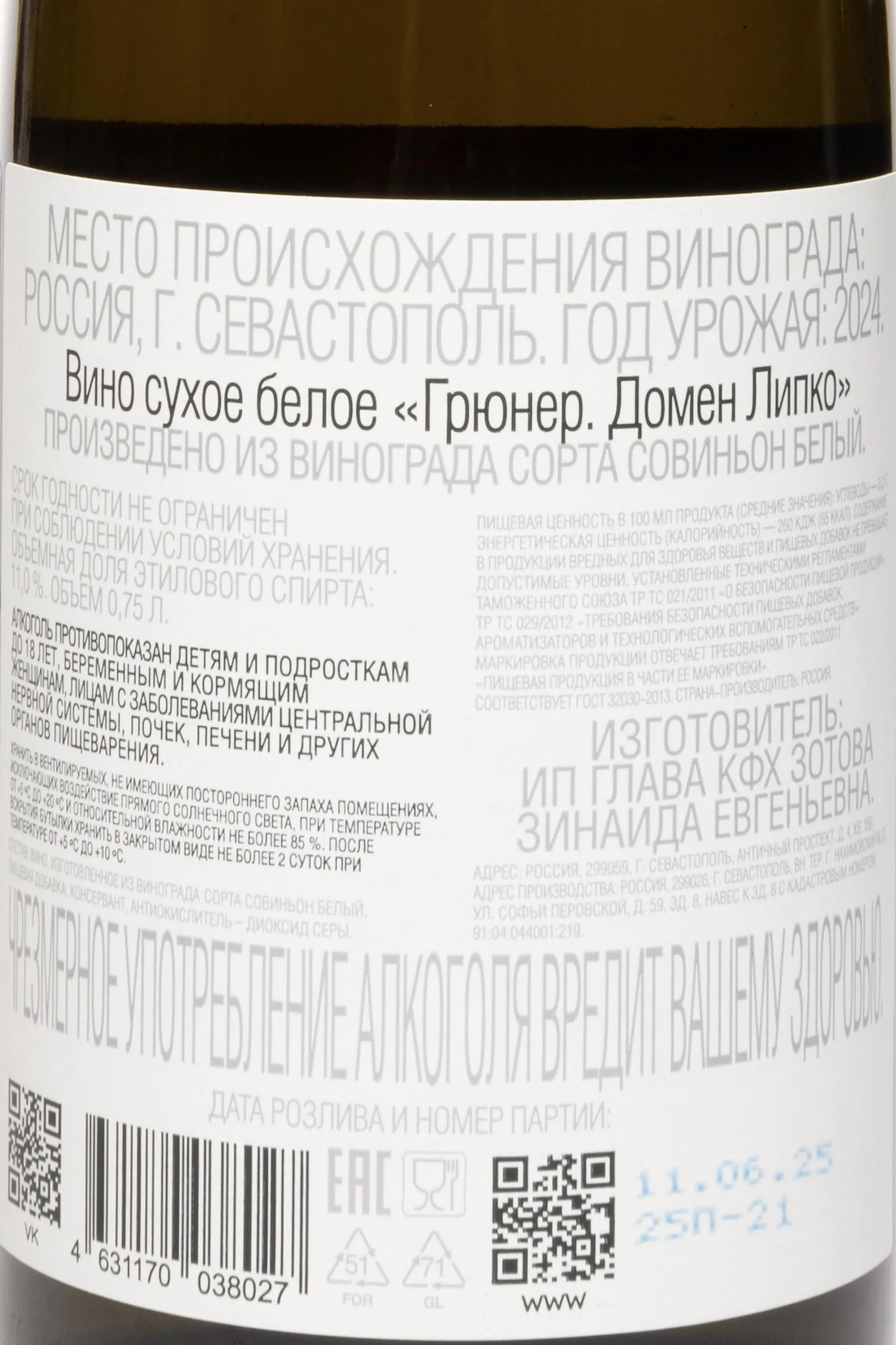 Вино Грюнер Домэн Липко Совиньон Блан 0,75 л создано крымской винной компанией «Домэн Липко» совместно с КФХ Зотова З.Е. из урожая, собранного вручную на участках с лозами старше 25 лет. Плантации расположены в зонах с известково-глинистыми почвами и выраженным морским влиянием, что формирует яркую минеральность и свежесть будущего напитка. Ягоды аккуратно сортируются, мягко прессуются и проходят ферментацию при контролируемой температуре в стальных чанах, позволяя сохранить сортовую чистоту и природную ароматическую интенсивность. Непродолжительная выдержка на тонком дрожжевом осадке придаёт структуру и глубину, не утяжеляя букет. Оттенок светло-соломенный с прозрачным блеском, отражающий аккуратную винификацию и свежесть урожая.