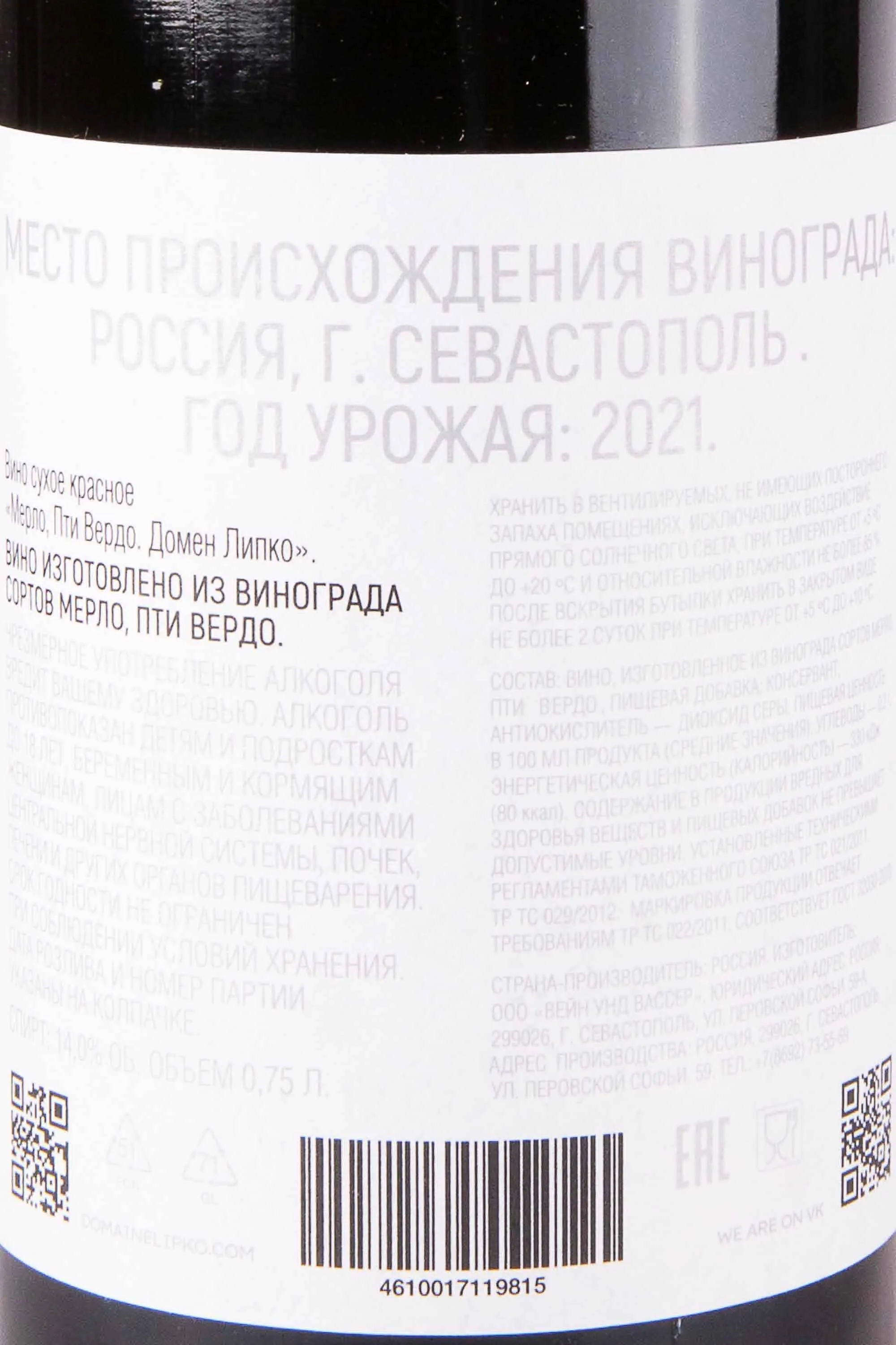 Вино Домэн Липко Мерло Пти Вердо 0,75 л создано в Крыму на базе винодельни «Домэн Липко». Купаж двух благородных сортов раскрывает потенциал местного терруара. Урожай для ассамбляжа собирали вручную на виноградниках КФХ Зотова З.Е., расположенных в зоне с тёплым солнечным климатом, известковыми и каменистыми почвами, обеспечивающими хорошую дренажную способность. Сочетание морских бризов и продолжительного вегетационного периода способствовало равномерному созреванию ягод и концентрации фенольных соединений. Ферментация проходила при контролируемой температуре с последующей выдержкой, позволившей смягчить танины и сформировать гармоничную структуру. Купаж Мерло и Пти Вердо придал напитку глубину и выразительность.