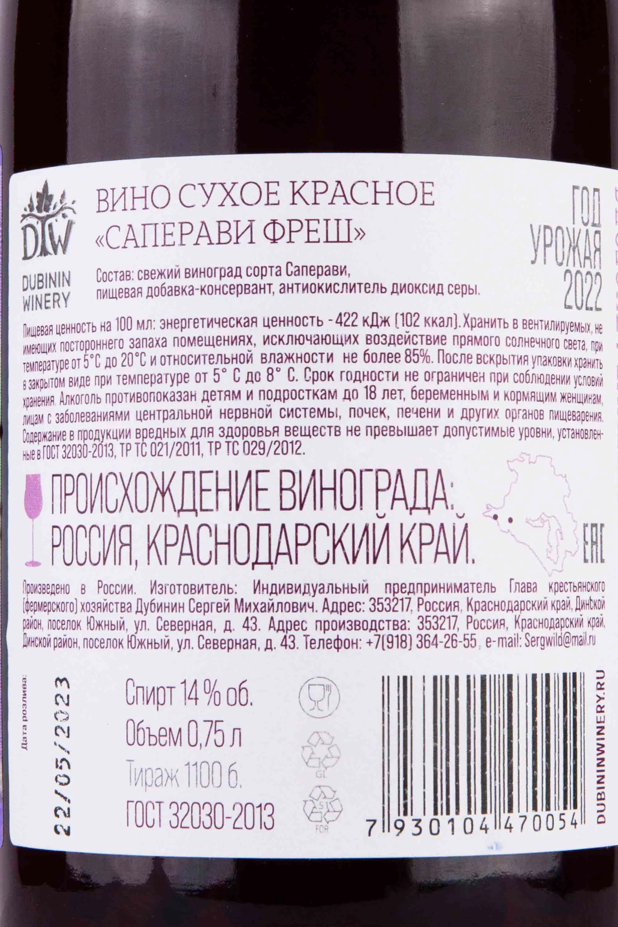 Вино Дубинин Вайнери Саперави Фреш 0,75 л создано на семейной винодельне Кубани. Хозяйство располагает собственными виноградниками и полностью контролирует цикл производства — от лозы до розлива. Проект был основан Сергеем Дубининым, оформившим КФХ, а позднее к управлению присоединился его сын Никита. Урожай собирают с лоз Саперави старше 25 лет, укоренённых в тёплом кубанском терруаре с продолжительным солнечным сезоном и умеренно-континентальным климатом. Почвы с хорошей дренажной способностью способствуют концентрации ягод. Ферментация проходит при контролируемых температурах для сохранения свежести и сортовой выразительности, что подчёркивает «фреш»-стиль — яркий, сочный и гастрономичный.