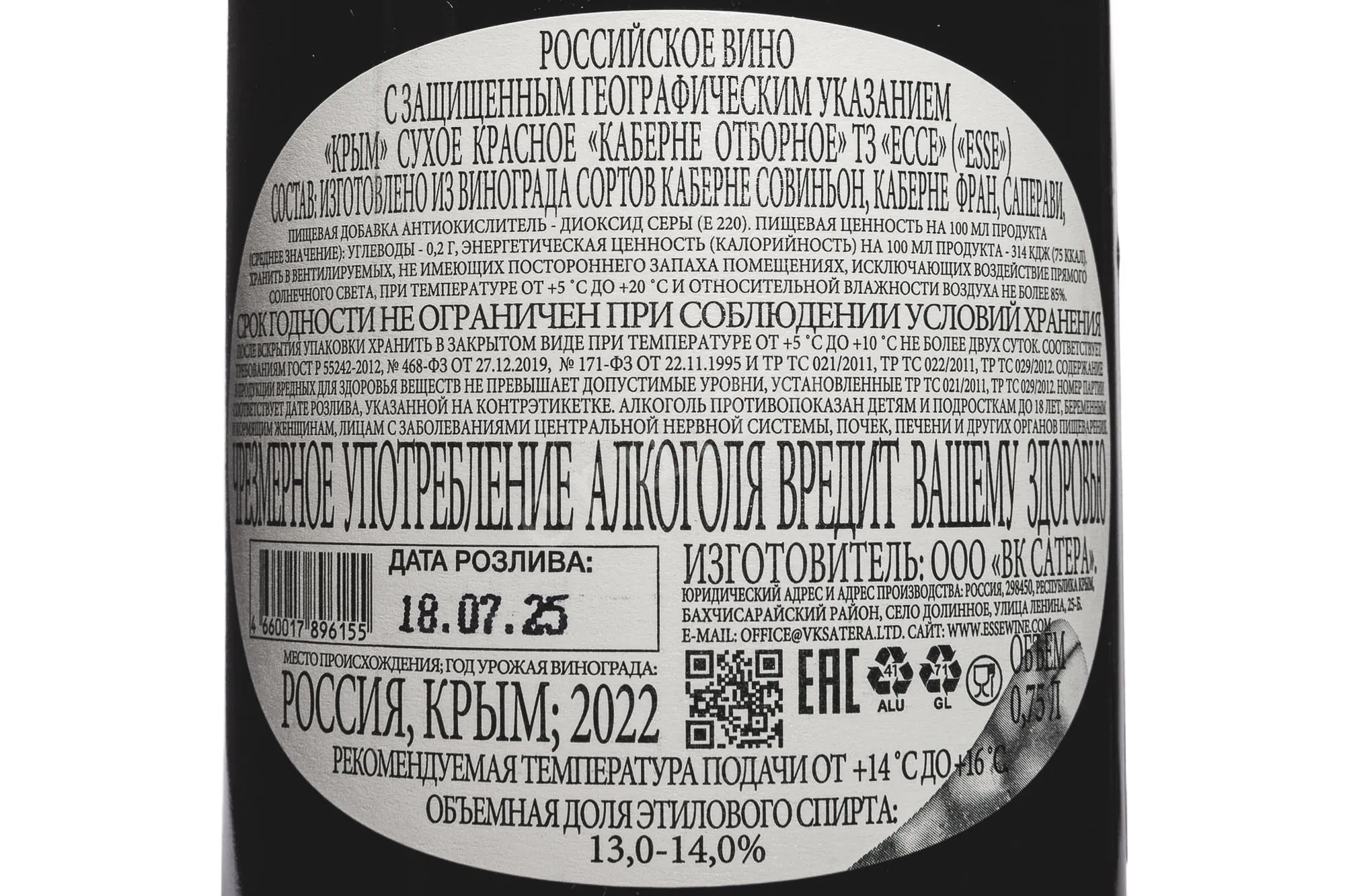 Красное сухое вино Ессе Каберне Отборное 2018 года 0,75 л создано в насыщенной и выразительной стилистике. В купаже были использованы 3 классических сорта. Виноградники расположены в южном терруаре с теплым климатом и легкими перепадами температур, что способствовало равномерному созреванию ягод. Урожай 2018 года оказался стабильным по качеству: лето было теплым, без экстремальной жары, осадки умеренные, поэтому виноград достиг нужной концентрации и баланса. Его собрали вручную и перевезли при контролируемой температуре, чтобы избежать окисления. После мягкого прессования сусло ферментировали на мезге в емкостях из нержавеющей стали при 25-28 °C, выполняя ремонтаж и пижаж для получения насыщенного цвета и аромата. Это вино отличается гармоничной структурой и фруктово-ягодным профилем.