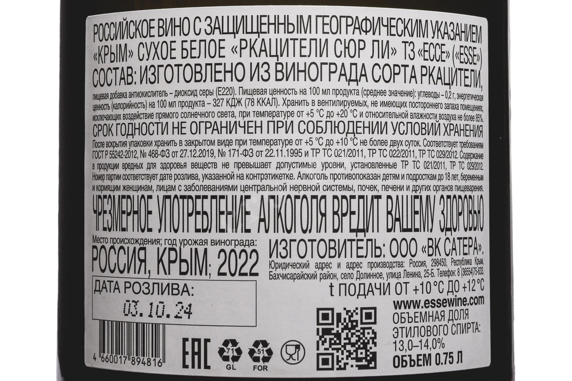 Белое сухое вино ЕССЕ Ркацители Сюр Ли 2022 года 0,75 л создано в сдержанном и чистом стиле. Акценты сделаны на минеральности и плотной текстуре, характерных для Ркацители, выращенного в прохладной долине реки Кача. Виноградники расположены на высоте около 300 метров, где делювиально-карбонатные почвы дают урожаю хорошую кислотность и стабильный баланс. Год урожая оказался ровным: умеренное тепло, достаточная влажность и отсутствие серьёзных стрессов для лозы. Сбор проводили вручную, чтобы сохранить качество ягод с десятилетних лоз. Ферментация проходила в дубовых бочках при контролируемой температуре, что обеспечило медленное развитие структуры. Выдержка на осадке во французском дубе (бочки второго наполнения) длилась около года. Такой подход сформировал сложный профиль. Это вино выделяется плотностью, точным балансом и глубоким вкусом. Оно привлекает внимание критиков благодаря аккуратной работе с сортом и стабильному качеству.