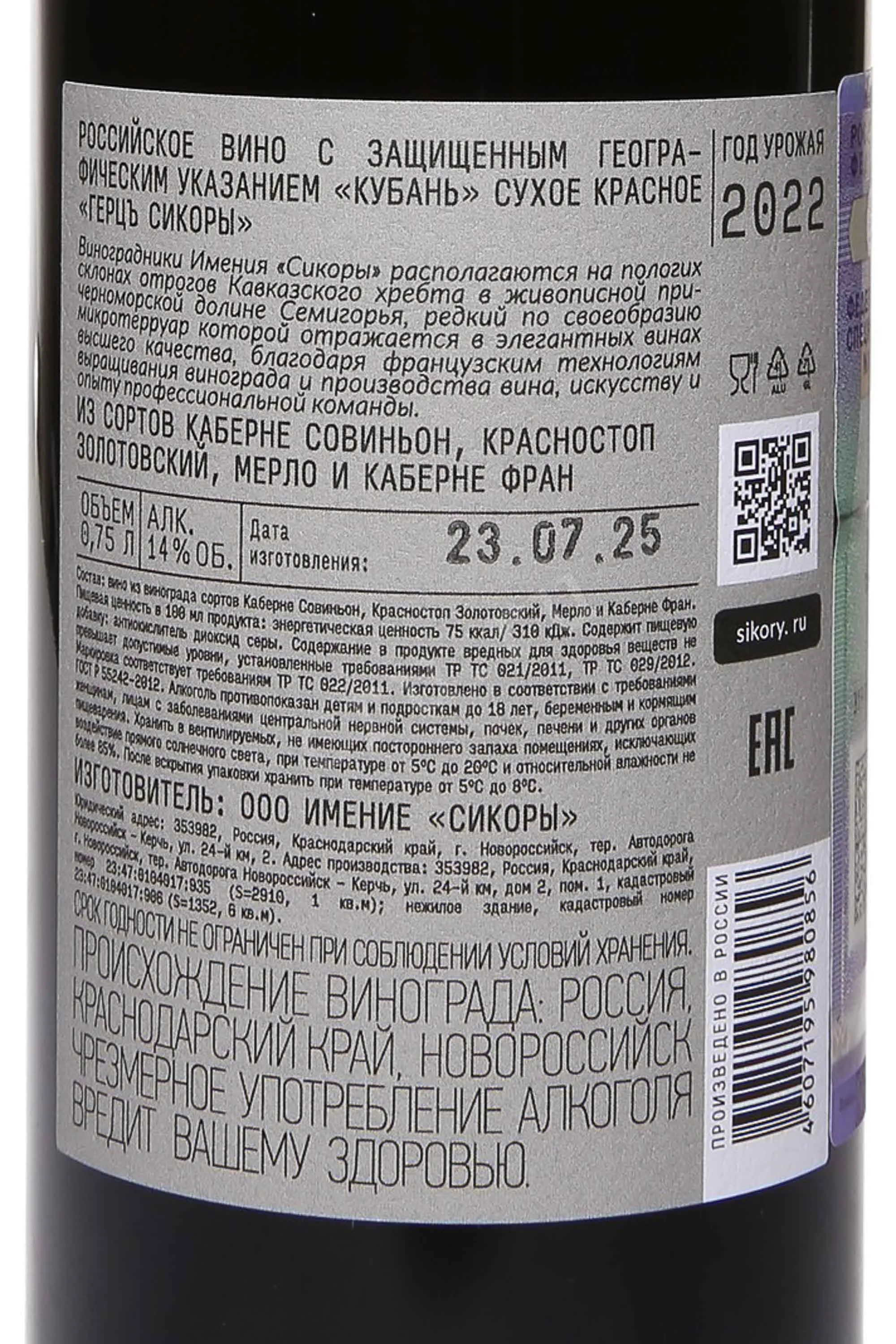 Красное сухое вино Сикоры Герцъ 2022 г. 0,75 л создано в Краснодарском крае, где кубанское хозяйство развивает локальный стиль с опорой на чистый терруар и мягкий климат. Напиток винифицировали из собранных вручную ягод. Урожай созрел на низких холмах с известняково-глинистыми почвами, наделившими плоды насыщенной органолептикой. Отсортированное сырьё ферментировали небольшими партиями, а до розлива — хранили в специальном помещении с постоянной влажностью и температурой. Образец выпущен под наименованием с защищенным географическим указанием «Кубань».
