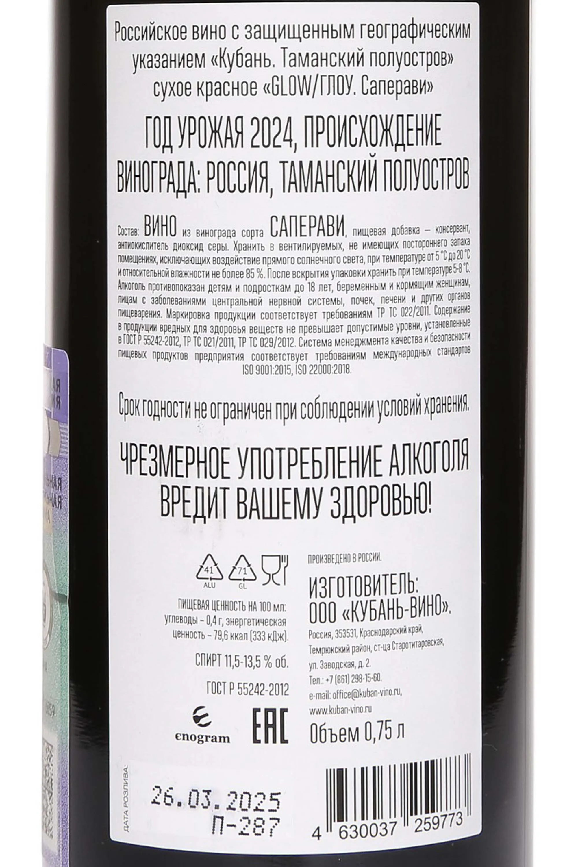 Красное сухое вино Глоу Саперави 2024 года 0,75 л создано из винограда, выращенного на Таманском полуострове. Для терруара характерны насыщенные минералами почвы и значительные перепады дневных и ночных температур. Урожай 2024 года оказался удачным: весна была мягкой, а лето тёплым и сухим, что обеспечило ягодам яркую концентрацию вкуса и гармоничный баланс кислотности. Ферментация проходила в стальных ёмкостях с контролем температуры, что позволило сохранить чистоту сортового аромата. Далее вино выдерживалось 6 месяцев в дубовых бочках, приобрело мягкие таннины и глубину вкуса. Уникальность заключается в сочетании традиционного характера Саперави и современного подхода к виноделию.