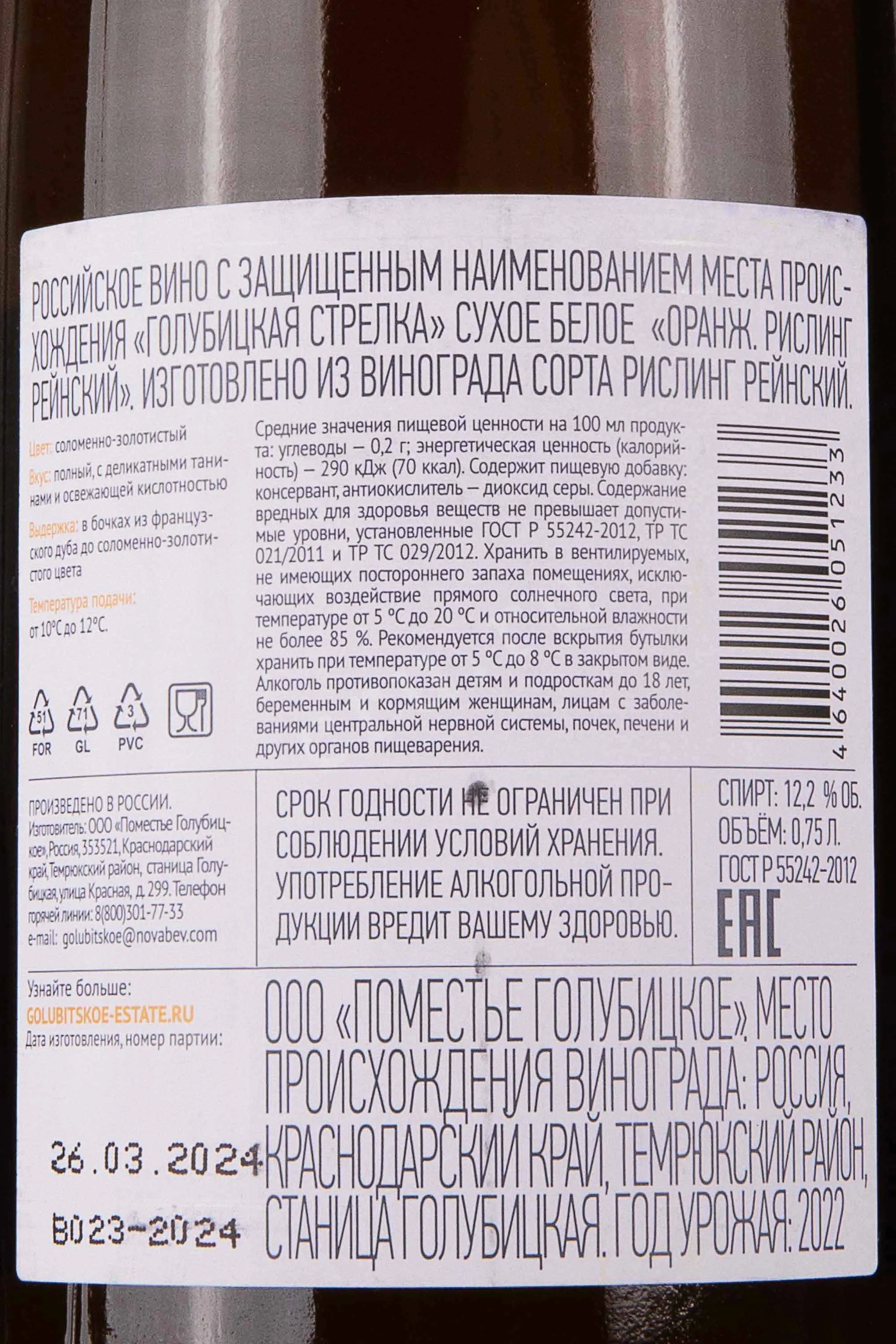 Вино Поместье Голубицкое Оранж 0,75 л создано на побережье Таманского полуострова, где морские бризы и известково-глинистые почвы формируют выразительный терруар. ООО «Поместье Голубицкое» — винодельня из Краснодарского края, работающая как с автохтонными, так и с международными сортами. Для этого образца используется Рислинг Рейнский, который прошёл мацерацию на мезге по «оранжевой» технологии, с последующей выдержкой на осадке в дубовых бочках не менее 6 месяцев. Такой подход обеспечивает структурность, сложность ароматики и глубину вкуса. Цвет светло-янтарный с золотистыми отблесками, отражающий особенности длительного контакта с кожицей.