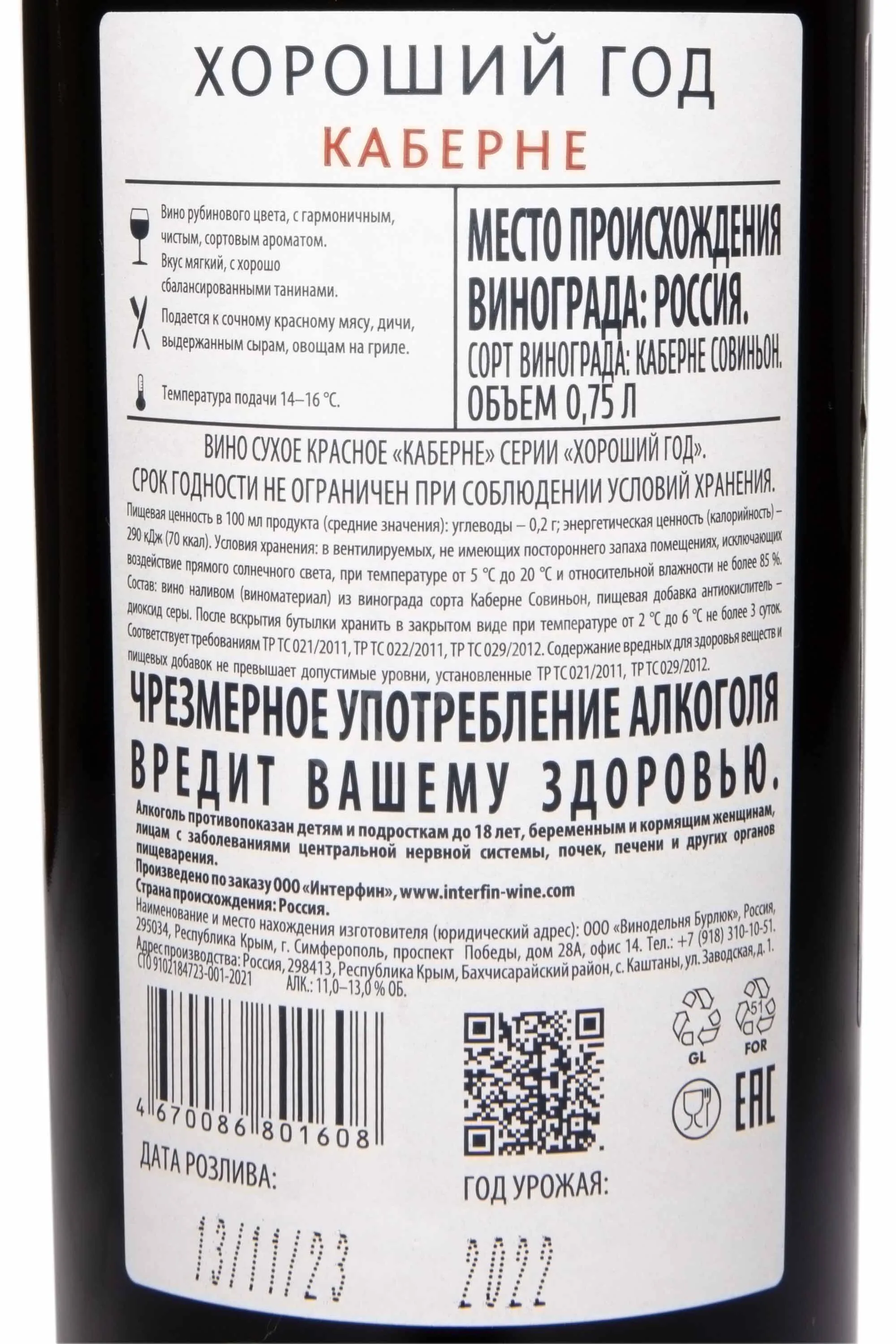 Вино Хороший год Каберне 0.75 л – российское красное сухое вино, которое представляет изысканную коллекцию от винодельни Валерия Захарьина. Производится из лучшего винограда, выращенного в Альминской и Качинской долинах Крыма. Урожай собирается исключительно при достижении определенного уровня зрелости. Изготавливается напиток классическим методом винификации в специальных резервуарах из нержавеющей стали со строгим контролем температуры. Выдержка проходит в дубовых бочонках в течение года. Российский напиток завоевал золотую медаль на международном конкурсе «Ялта. Золотой Грифон-2015».