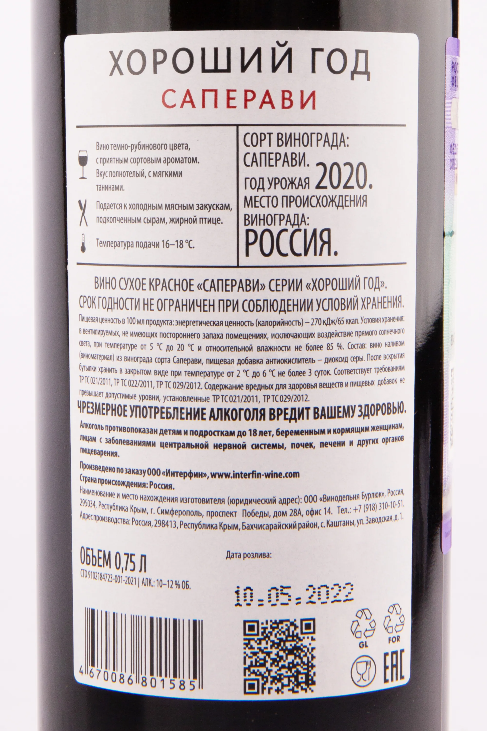 Вино Хороший Год Саперави 0.75 л – красный сухой российский напиток, который был создан лучшими виноделами именитого дома Валерия Захарьина. Производится он из отборного винограда, выращенного в Крыму. Высококачественный урожай собирается лишь при достижении оптимального уровня зрелости. Изготавливается по традиционному методу винификации в резервуарах из нержавеющей стали со строгим контролем температуры. Процесс выдержки проходит в бочонках из дуба, в специальных подвалах винодельни.