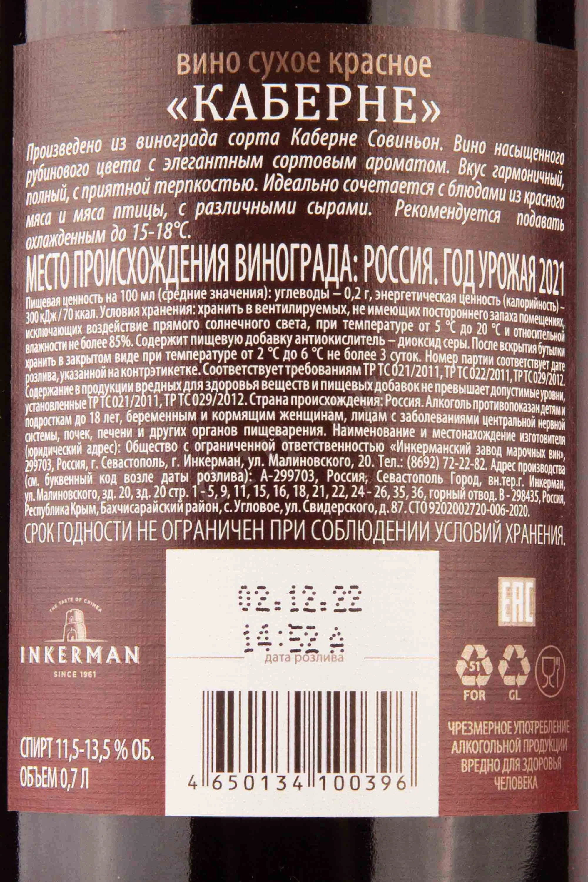 Вино Инкерман Каберне 0,7 л создано на базе винограда, выращенного на холмистых участках долины реки Кача в Крыму — регионе с мягким морским климатом, известняковыми почвами и значительными суточными перепадами температур, способствующими накоплению сахаров и сохранению кислотности. Производством занимается «Инкерманский производственный завод», один из ключевых винодельческих центров региона. Сырьё проходит классическую ферментацию при контролируемой температуре с последующей выдержкой, позволяющей раскрыть сортовой характер Каберне. Технология направлена на сохранение природной структуры и формирование гармоничного вкусового профиля с выраженной глубиной.