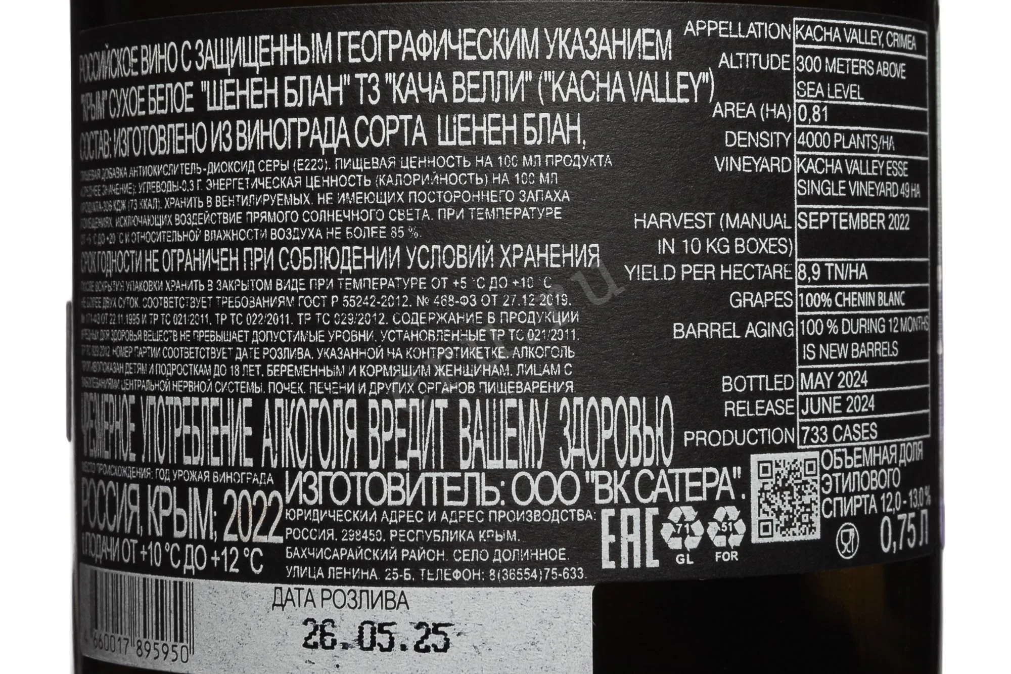 Красное сухое вино Kacha Valley Chenin Blanc 2022 г. 0,75 л сделано из плодов с одного виноградника, расположенного на высоте 300 метров над уровнем моря. Площадь участка составляет 8,1 га, плотность посадки — 4000 лоз на гектар. Урожай собирали вручную в сентябре, в ящики по 10 кг. Урожайность составила 8,9 т/га. Алкогольная ферментация и последующая выдержка проходили в новых дубовых бочках; срок выдержки составил 12 месяцев. Такой подход сформировал более сложную текстуру и добавляет структуру сорту, традиционно ассоциируемому со свежими стилями. Розлив был осуществлен в мае 2024, релиз состоялся в июне того же года. Напиток выпустили тиражом 733 ящика.
