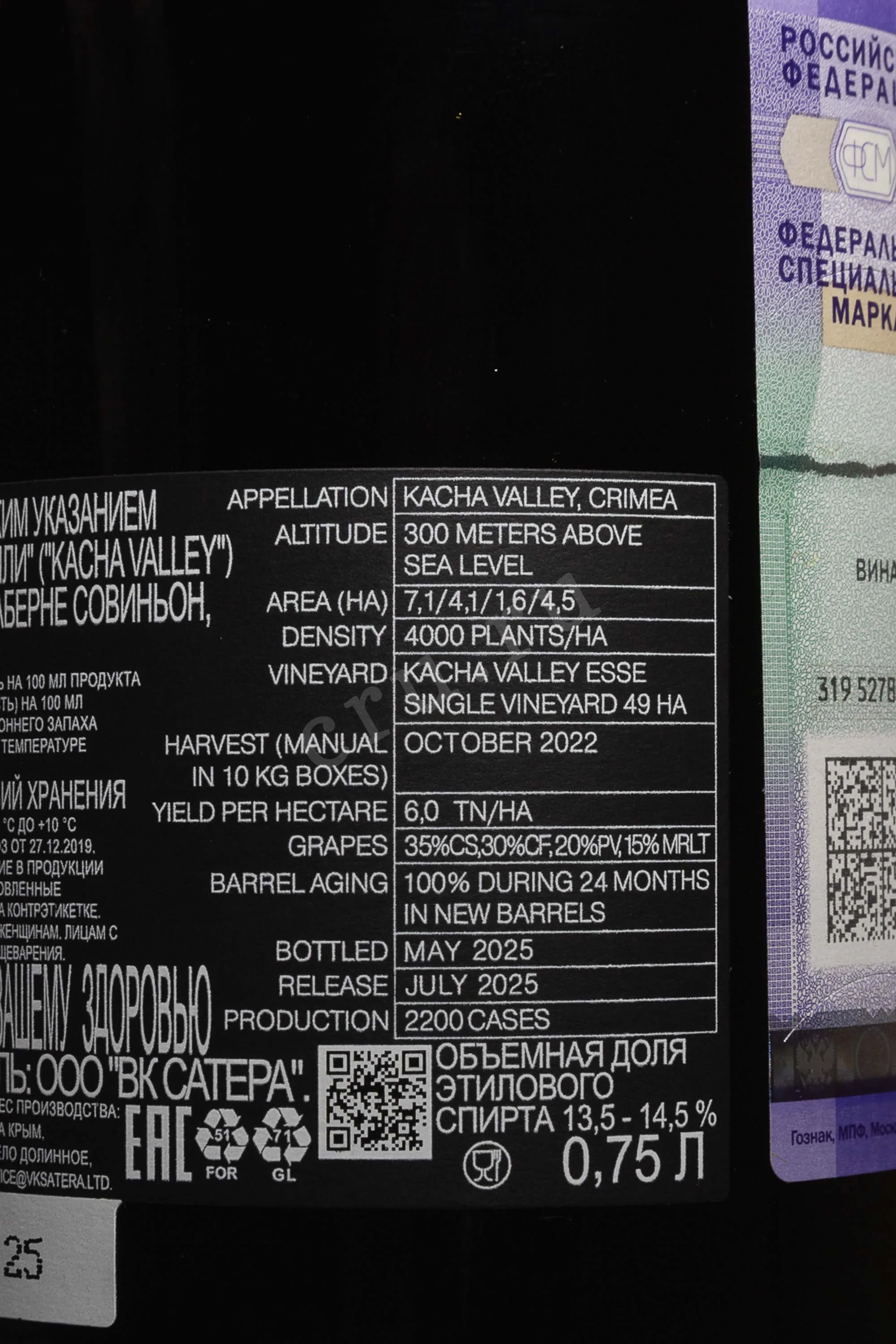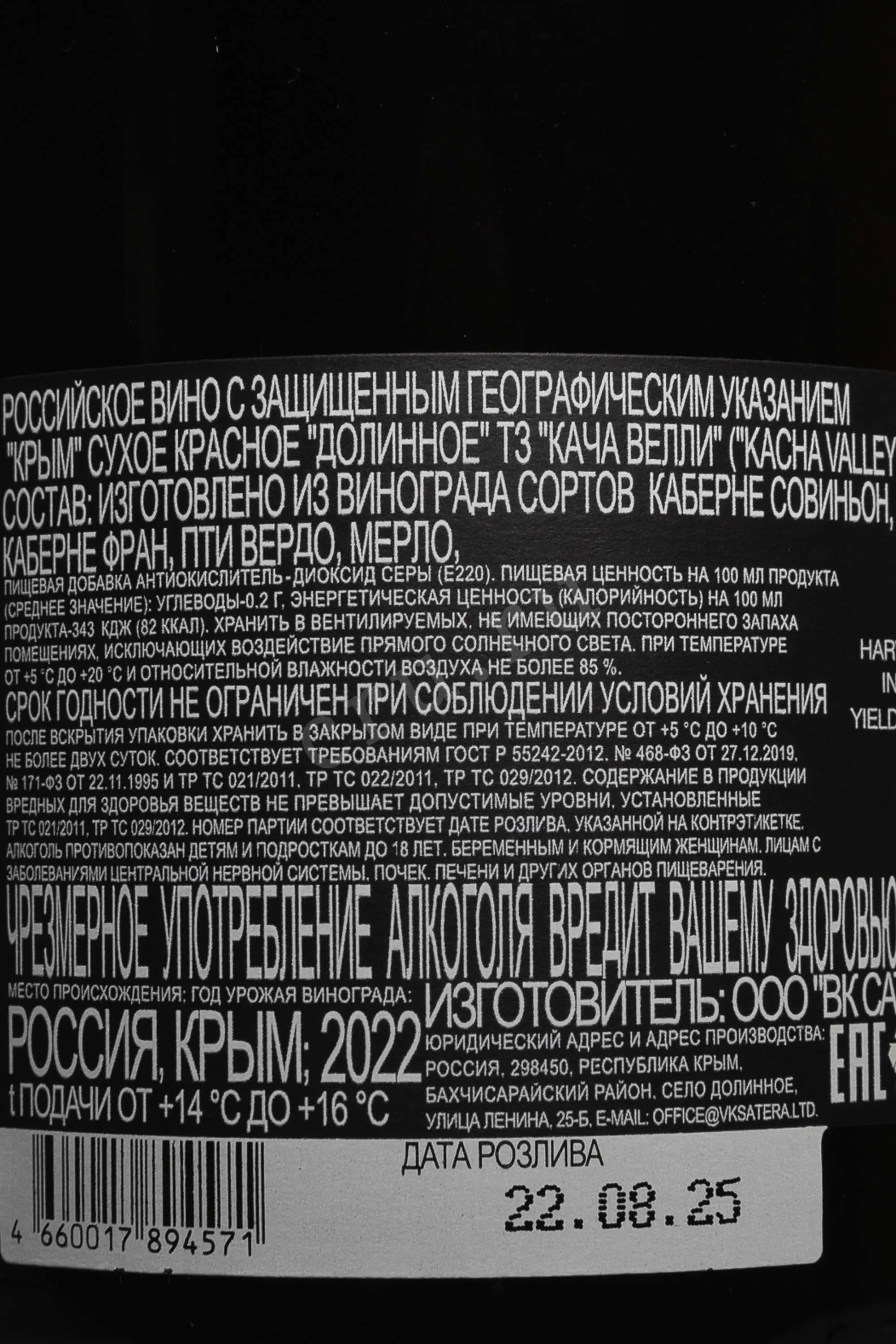 Красное сухое вино Kacha Valley Dolinnoe 2022 г. 0,75 л создано в Крыму, в долине реки Кача, где мягкий климат сочетается с хорошей инсоляцией и умеренным влиянием моря. Виноградники расположены на высоте 300 метров над уровнем моря, на преимущественно суглинистых и известковых почвах, что способствует сохранению кислотности и формированию сбалансированного букета. Посадка 4000 лоз на гектар обеспечивает высокое качество урожая. Ягоды хорошо вызрели, собрали их в октябре вручную в ящики по 10 кг при урожайности 6 т/га. Ферментация проходила в ёмкостях из нержавеющей стали с контролем температуры. Выдержку провели в течение 24 месяцев в новом дубе. тираж впущен в количестве 2200 ящиков.