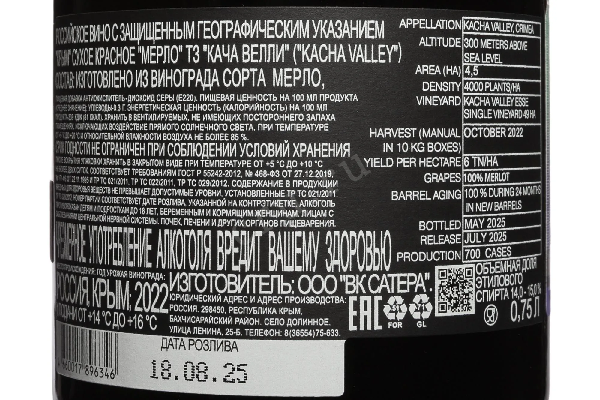 Красное сухое вино Kacha Valley Merlot 2022 г. 0,75 л изготовлено из ягод с виноградников, расположенных на высоте 300 метров над уровнем моря в терруаре долины реки Кача. Площадь участка составляет 4,5 га, плотность посадки — 4000 лоз на гектар, что соответствует умеренно интенсивной модели виноградарства. Виноград собрали вручную в октябре в 10-килограммовые ящики, чтобы сохранить целостность. Урожайность составила около 6 т/га. Алкогольная ферментация проводилась с температурным контролем. После брожения напиток созревал в новых дубовых бочках в течение 24 месяцев. Розлив состоялся в мае 2025 года, в количестве 700 ящиков.