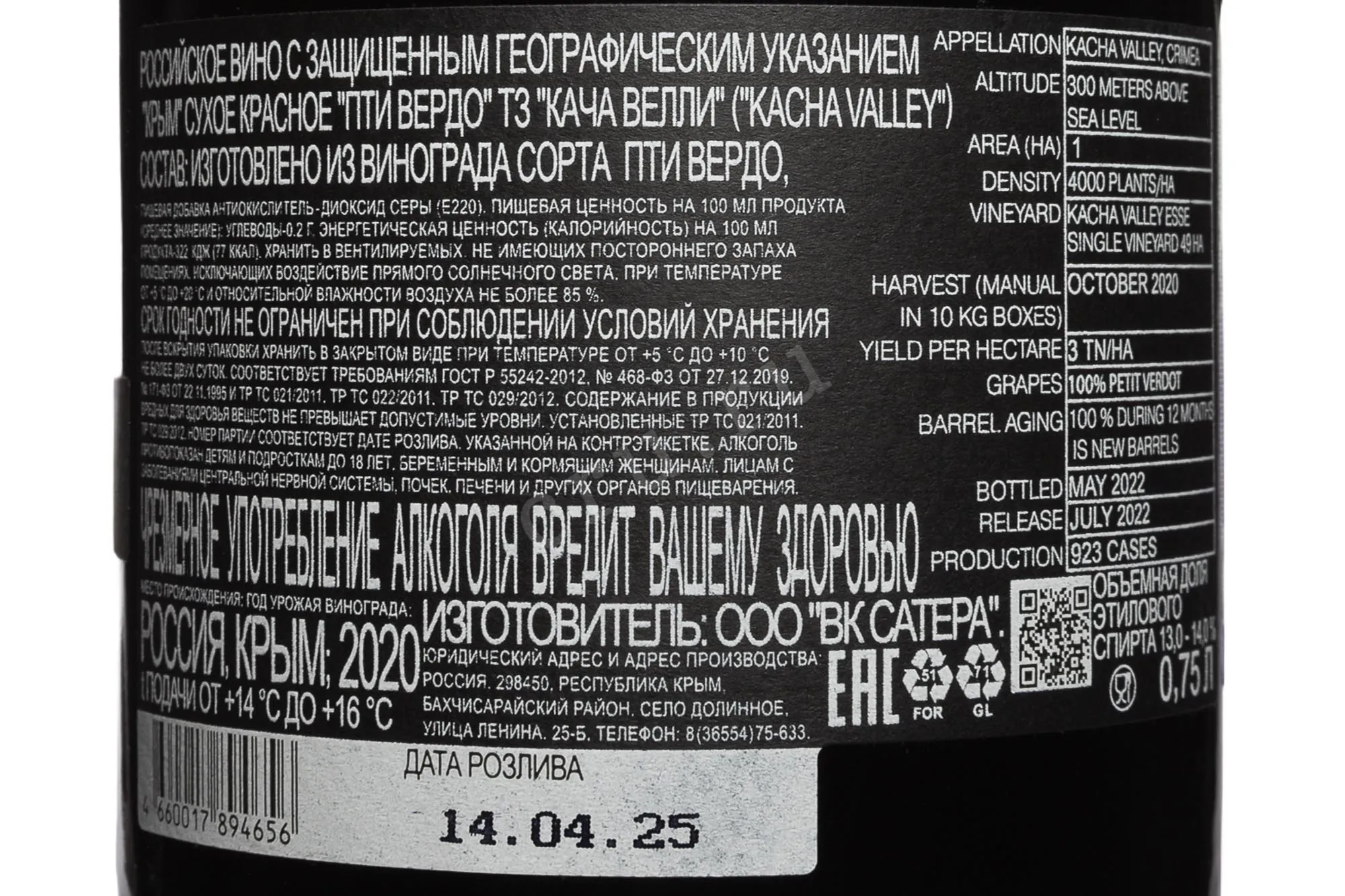 Красное сухое вино Kacha Valley Petit Verdot 2020 г. 0,75 л происходит с виноградника на высоте 300 метров над уровнем моря. Участок площадью 4,8 га засажен с плотностью 4000 растений на гектар, что способствует концентрации вкуса и равномерному созреванию ягод. Урожай собрали вручную в октябре в ящики по 10 кг. Урожайность составила около 3 т/га, что указывает на строгий контроль нагрузки на лозу. Ферментация проходила с температурным контролем. После брожения напиток выдерживался в новых дубовых бочках в течение 24 месяцев. Розлив был осуществлен в мае 2022 года, релиз состоялся в июле 2022 года. Общий объём производства составил 923 ящика.