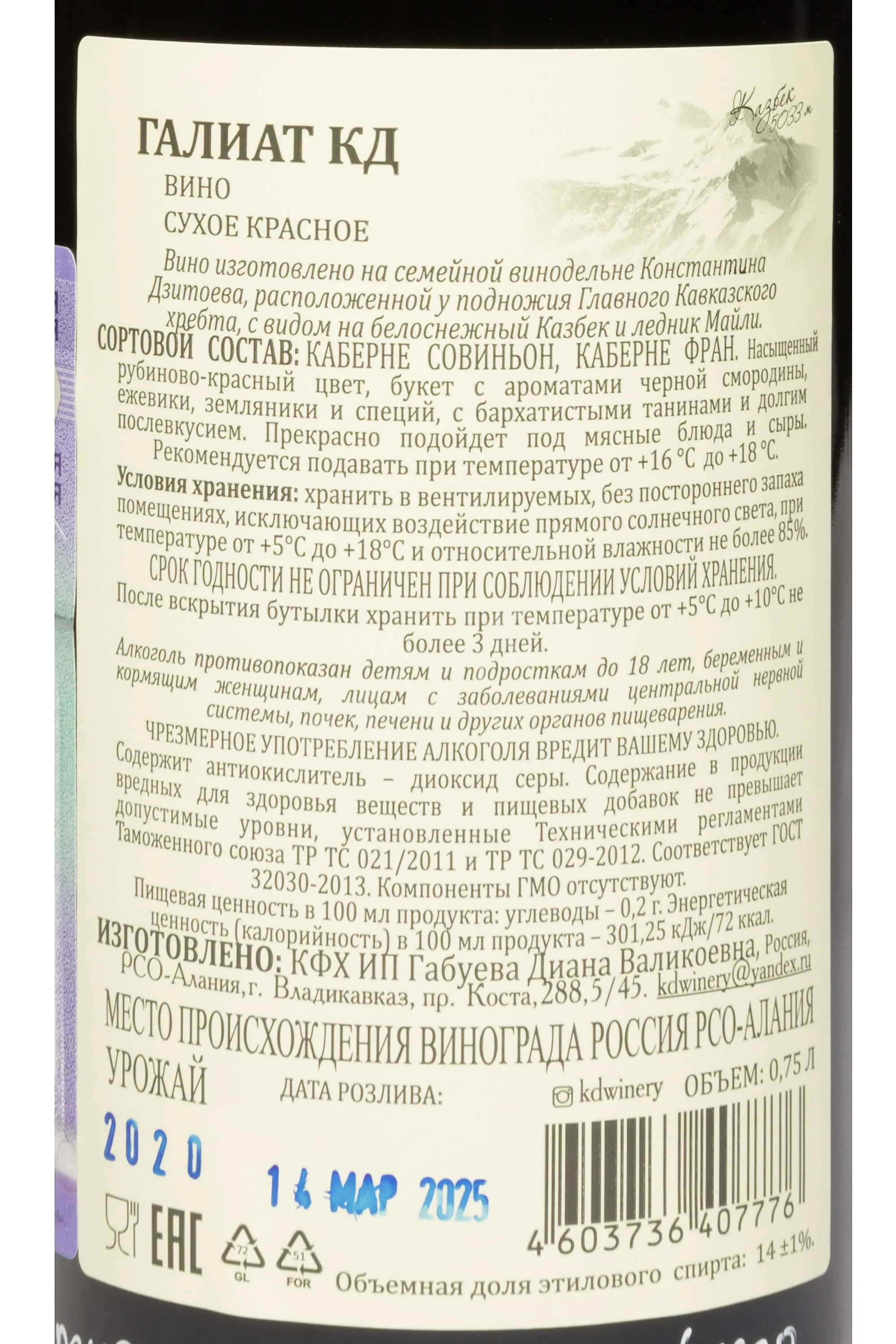 Красное сухое вино Константин Дзитоев Галиат 2020 года 0,75 л создано в Северной Осетии и отражает характер горного терруара. Оно названо в честь исторического села в Ирафском районе. Виноград был выращен на склонах с каменистыми и известковыми почвами, где дневное солнце сочетается с прохладой ночей. Урожай 2020 года был сбалансированным по погоде: теплая весна и умеренно жаркое лето позволили ягодам набрать спелость без потери кислотности. Ферментация проходила в стальных резервуарах с контролем температуры для сохранения аромата. Выдержка проходила в дубовых бочках длилась 12 месяцев, что придало вину сложность и мягкость.