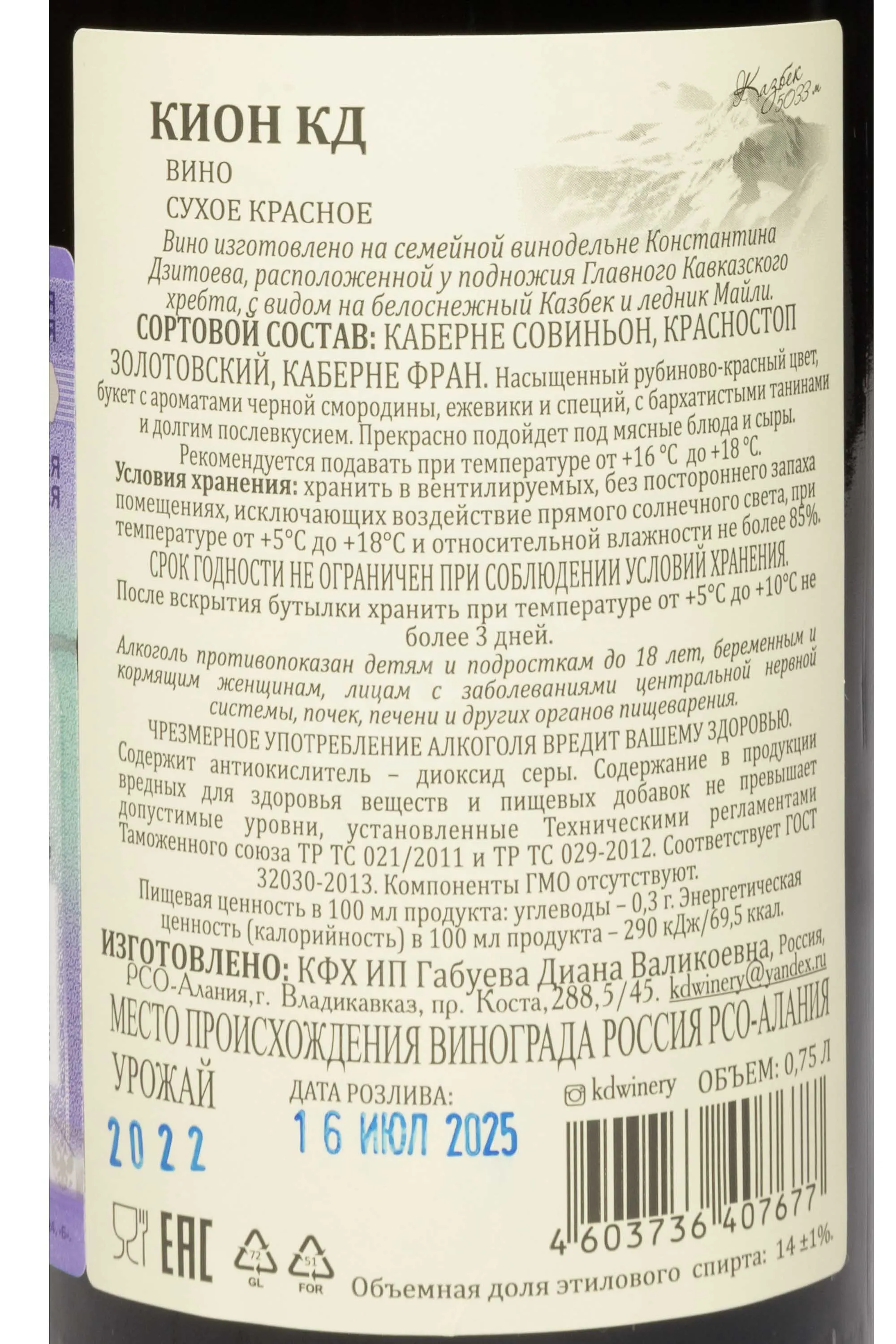 Красное сухое вино Константин Дзитоев Кион Резерв СВ 2022 г. 0,75 л — авторский релиз с акцентом на горный характер терруаров Северной Осетии. Лозы здесь растут на склонах с каменистыми почвами и естественным дренажом. Такие условия ограничивают урожайность и создают более концентрированную ягоду. Год выдался тёплым и сухим, поэтому виноград созрел рано и накопил насыщенный сок. После ручного сбора плоды перебрали, мягко дробили и ферментировали при контролируемой температуре. Выдержка в бочках проходила аккуратно, без избыточного влияния дуба.