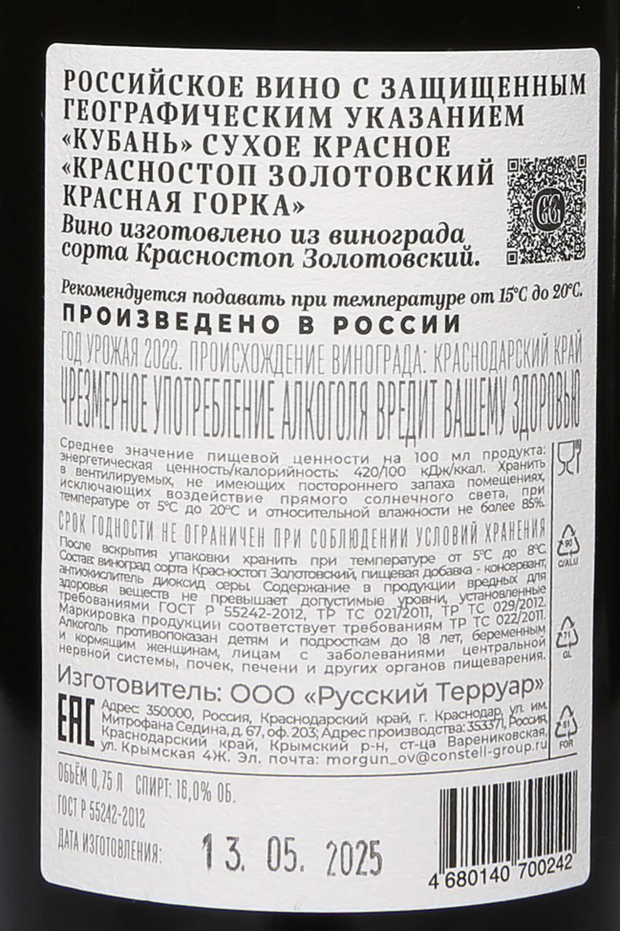 Красное сухое вино Галицкий и Галицкий Красностоп Золотовский Красная Горка 0,75 л создано из ягод автохтонного сорта, который традиционно выращивают на юге России. Виноградники расположены на склонах терруара Красная Горка в Краснодарском крае. Почвы здесь насыщены глиной и известняком, что придает плодам особую минеральность. Участок находится на высоте около 200 метров над уровнем моря, с хорошей вентиляцией и умеренным количеством осадков. Урожай собирают вручную, выбирая только полностью зрелые грозди. В процессе винификации сусло ферментируется в нержавеющих емкостях, после чего частично выдерживается в дубе, что формирует глубокий и гармоничный характер напитка.