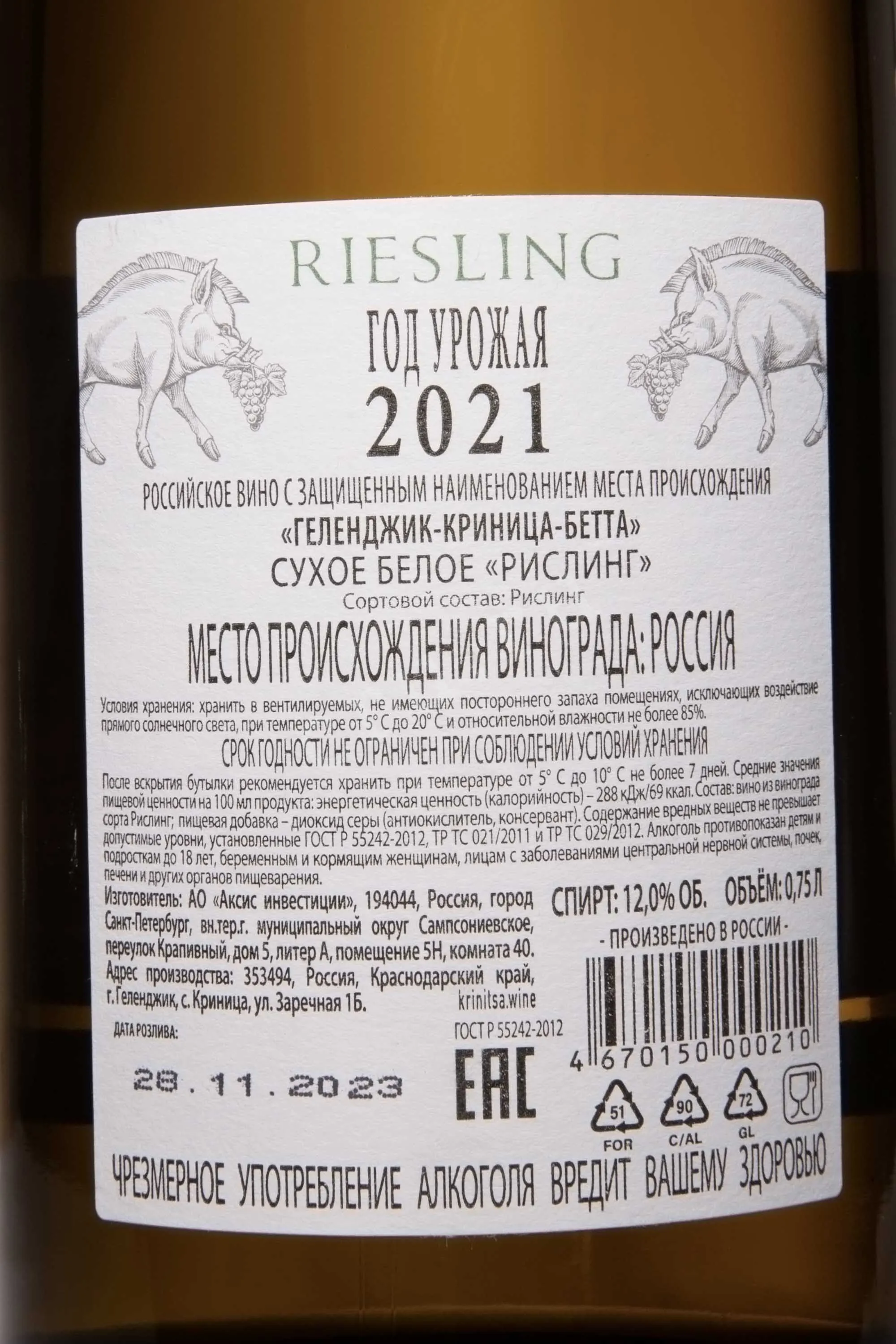 Вино Криница Рислинг, Геленджик-Криница-Бетта 0,75 л — выразительный образец южнороссийского терруара с акцентом на чистоту сорта и многослойность структуры. Напиток создан на винодельне «Криница» в Краснодарском крае, в окрестностях Геленджика, где климатические условия близки к бордосским параллелям. Виноградники расположены на участках у реки Пшада, впадающей в Чёрное море; мергелево-известняковые почвы формируют минеральную основу и свежесть профиля. Урожай Рислинга Рейнского собирается выборочно, применяется бережное прессование цельных гроздей. Сусло с разных участков ферментируется раздельно: 50% — в бетонных ёмкостях, 50% — в стальных, после чего проводится выдержка по методу сюр ли и дополнительная выдержка не менее 8 месяцев в бочках французского дуба, что придаёт текстуре глубину и сливочную округлость.