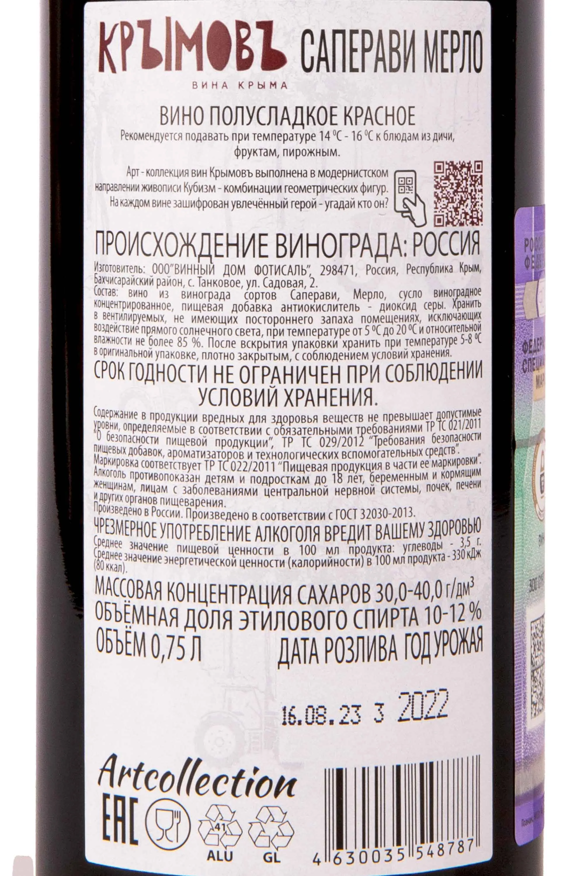 Крымовъ Саперави Мерло 2022 0.75 л купить - Российское вино Kryimov Saperavi Merlot цена в магазине КРЮ ПРОФИ г. Москва, ул. Профсоюзная, д. 16/10 10:00-22:00 Ежедневно +7 (495) 920-20-02 info@cru.ru