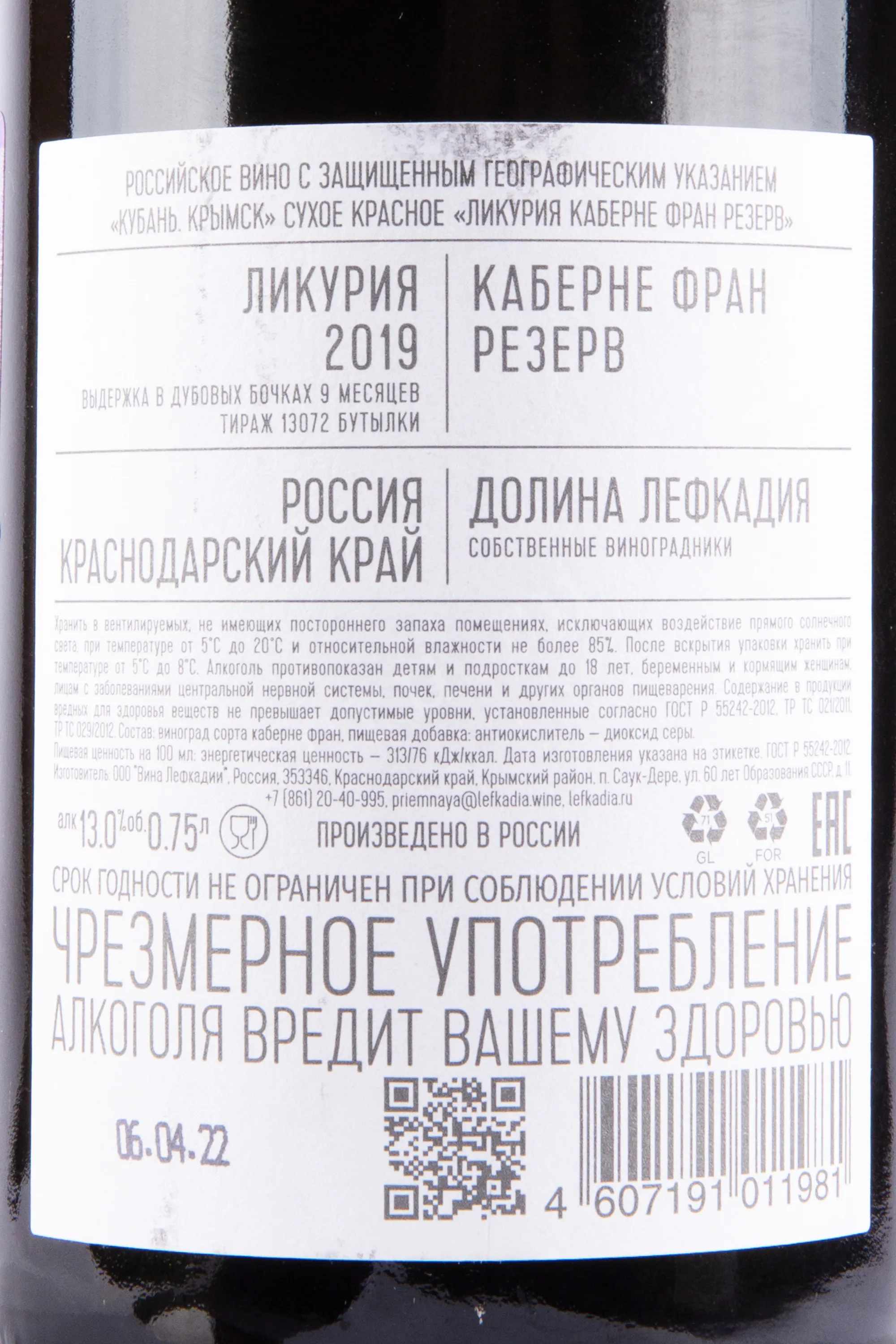 Вино Ликурия Каберне Фран Резерв 2019 0.75 л