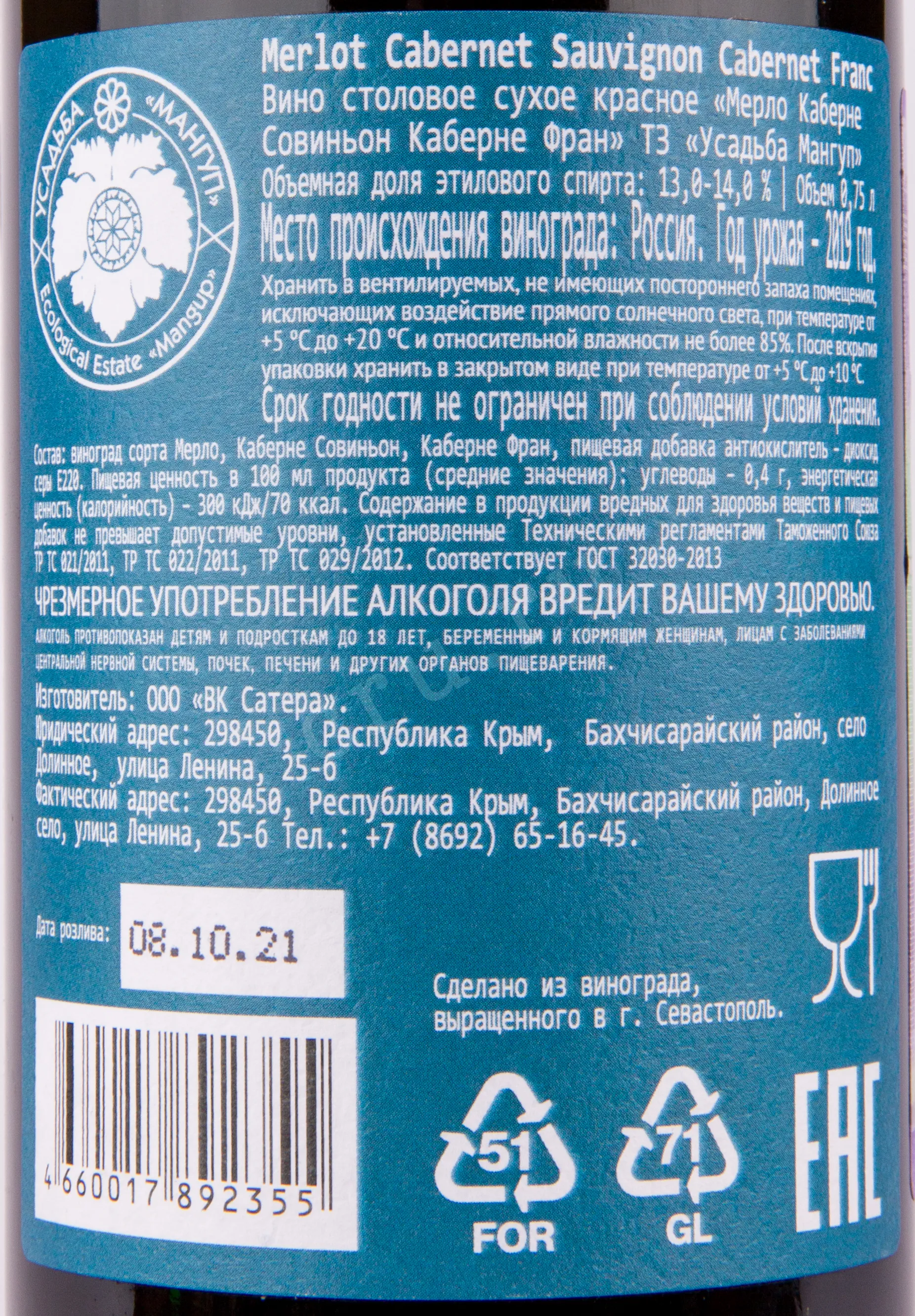 Вино Мангуп Мерло, Каберне Совиньон, Каберне Фран 0,75 л представляет линейку «Мангуп» крымской винодельни ВК Сатера и создано из классического бордосского трио сортов, выращенных в южных районах полуострова. Терруар отличается сочетанием солнечного климата, известково-глинистых почв и близости Чёрного моря, что обеспечивает медленное и равномерное созревание ягод с высокой концентрацией ароматических веществ. Урожай собирается при оптимальной фенольной зрелости, после чего применяется традиционная винификация с контролируемой ферментацией и выдержкой, позволяющей раскрыть структуру и глубину купажа. Цвет напитка — чернильно-рубиновый, подчёркивающий его насыщенный характер.