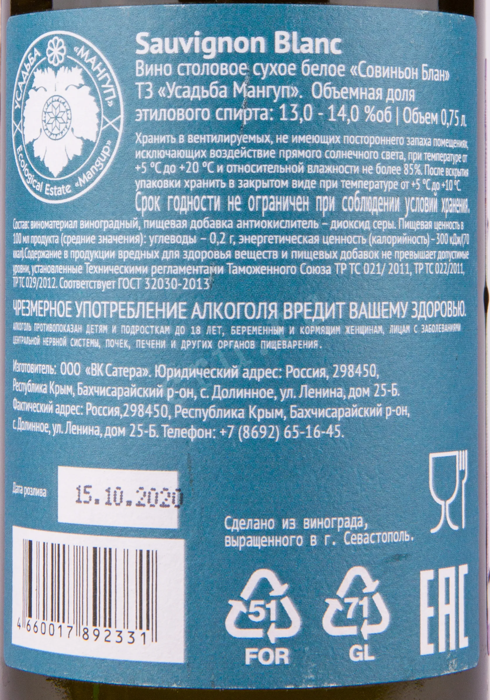 Вино Мангуп Совиньон Блан 0,75 л создаётся винодельней «ВК Сатера» из винограда, выращенного в долине реки Кача Бахчисарайского района — регионе с выраженным континентально-морским влиянием, известным значительными суточными перепадами температур и известково-глинистыми почвами. Такой терруар способствует формированию яркой кислотности и сложной ароматической структуры ягод. Урожай собирается в оптимальной стадии зрелости, после чего применяется щадящее прессование и контролируемая ферментация при низких температурах, позволяющая сохранить свежесть и сортовую выразительность Совиньон Блан.