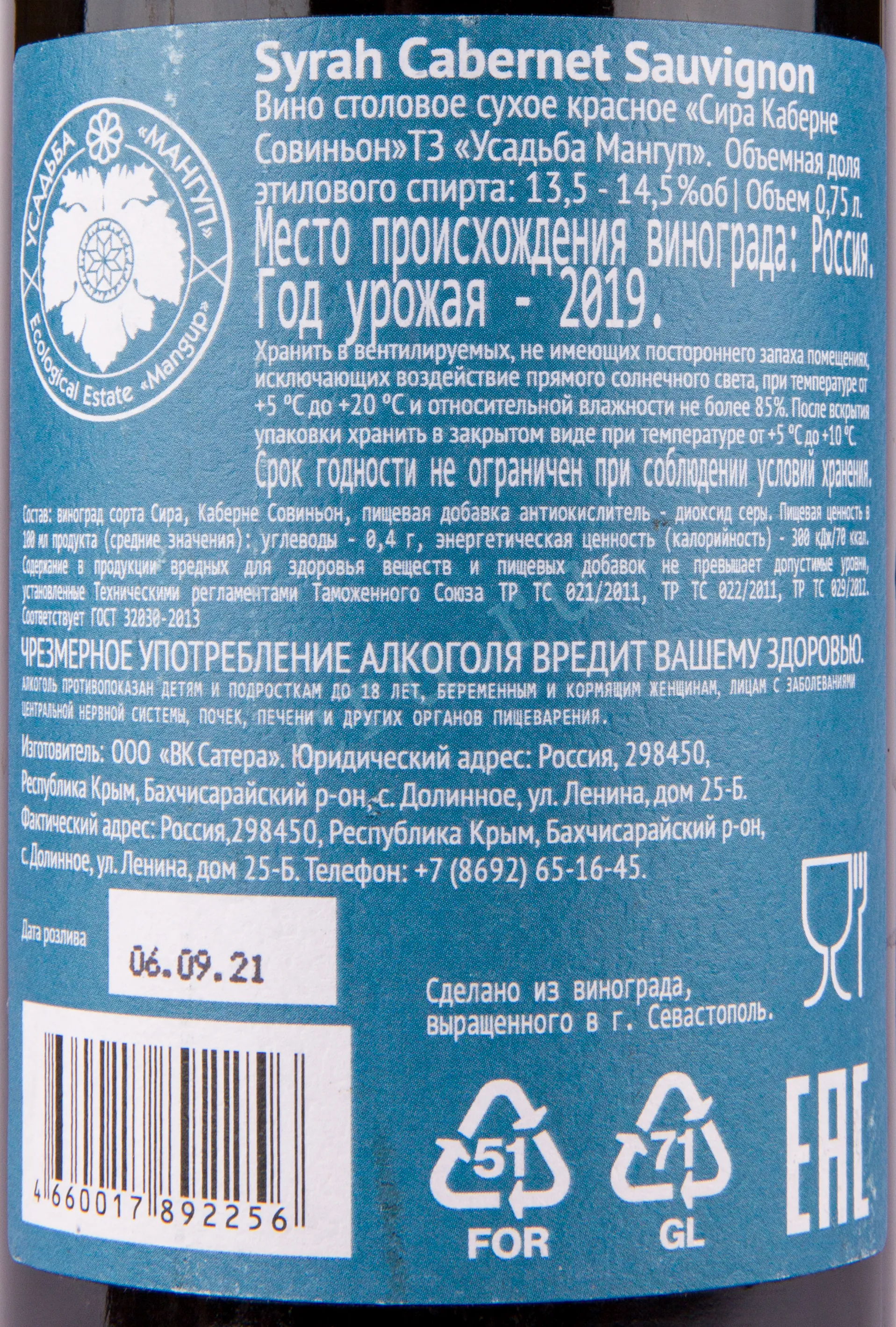 Вино Усадьба Мангуп Сира и Каберне Совиньон 0,75 л создано из купажа благородных сортов, выращенных в Бахчисарайском районе Крыма, в долине реки Чёрная, где мягкий климат сочетается с известково-глинистыми почвами и выраженными суточными перепадами температур. Такие условия способствуют равномерному созреванию ягод и формированию сложного ароматического профиля. Винная компания Усадьба Мангуп применяет классическую технологию винификации с контролируемой ферментацией и последующей выдержкой в дубовых бочках не менее 10 месяцев, что придаёт напитку глубину и структурность. Купаж сортов гармонично объединяет насыщенность и пряность Сиры с плотной танинной основой Каберне Совиньон, формируя выразительный характер и длительное послевкусие.