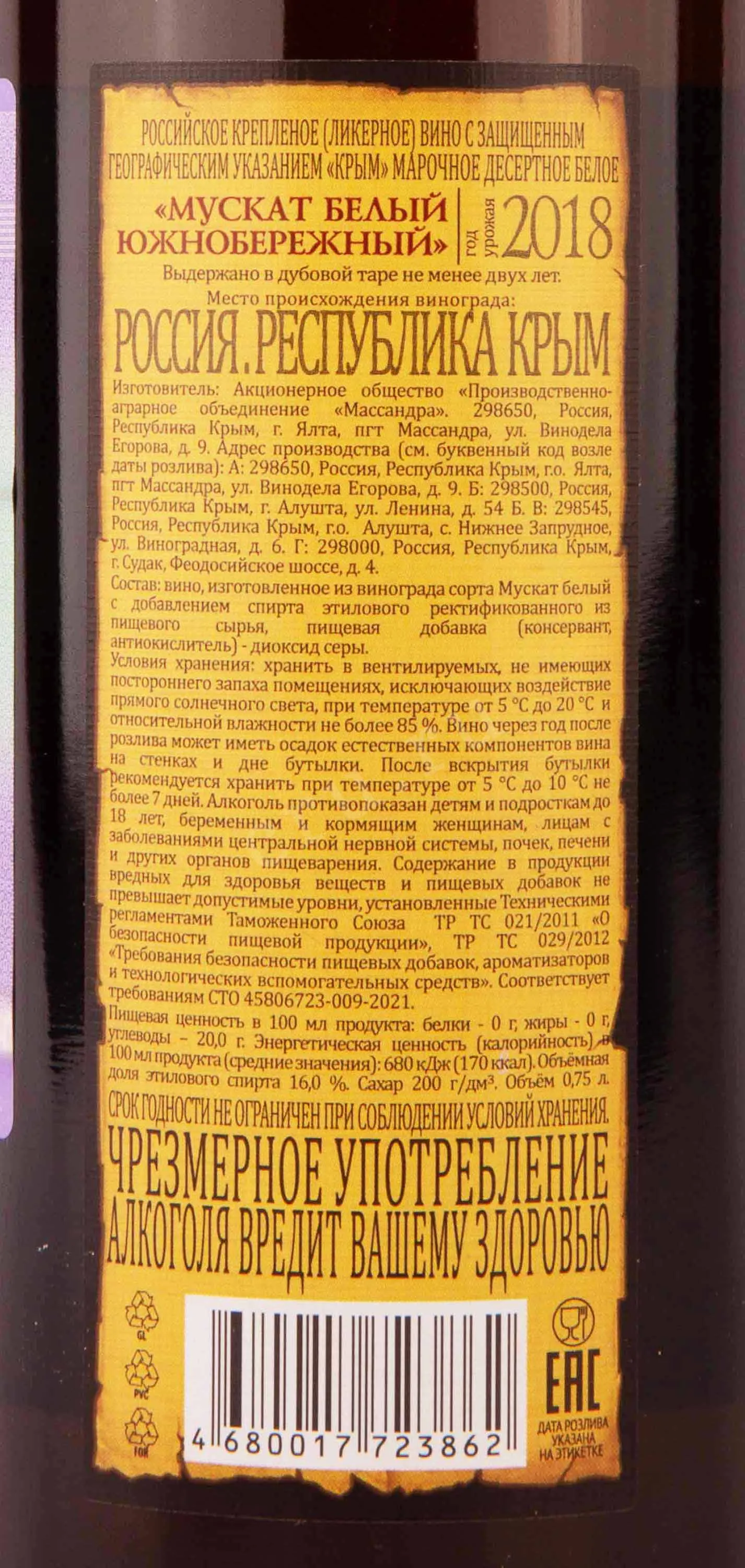 Вино Массандра Мускат Белый Южнобережный 2018 0.75 л