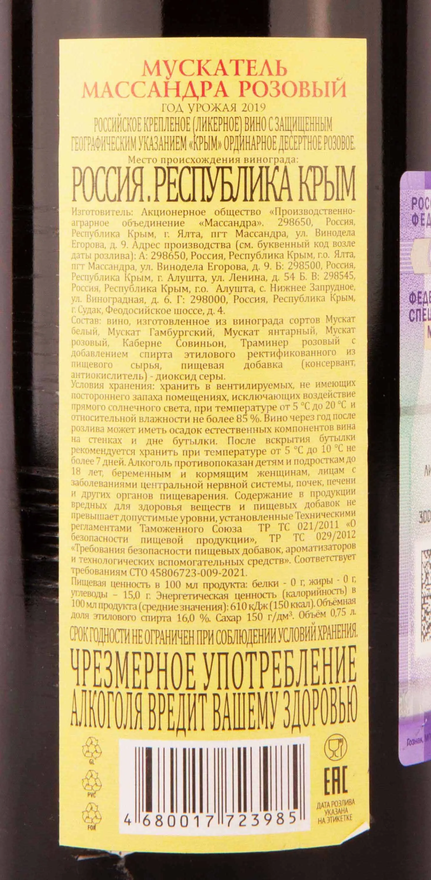 Вино Massandra Muskatel Rose 2019 0.75 l – это ординарный алкоголь от российского производителя, созданный из белых и красных сортов винограда урожая 2019 года. Ягоды собирают ручным способом. Гроздья сортируют и подвергают деликатному прессованию. Полученный сок непродолжительное время настаивают на кожице, а после сбраживают при постоянно контролируемой температуре. Перед бутилированием напиток выдерживают в стальных резервуарах и фильтруется для удаления осадка. Готовое розовое сладкое вино обладает крепостью 16% и уровнем сахара 150 г/л.