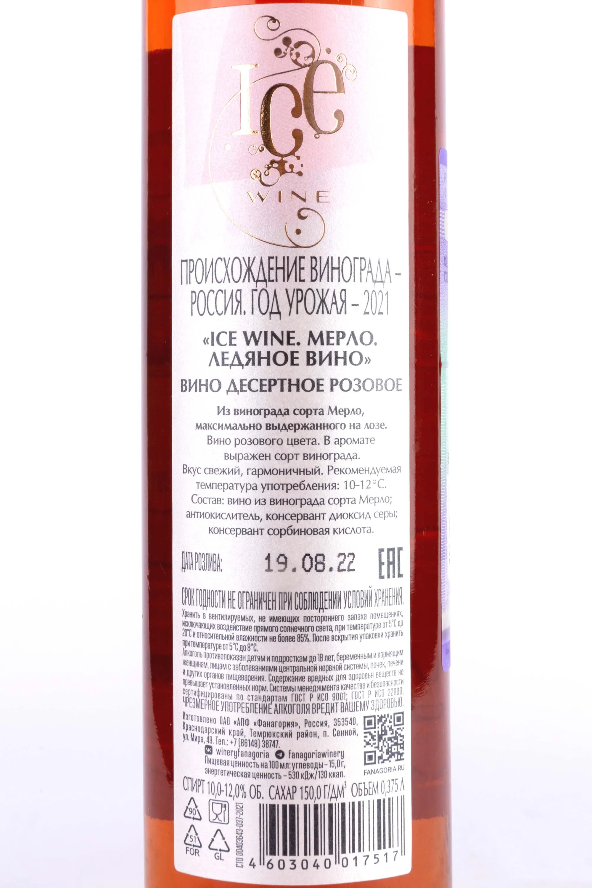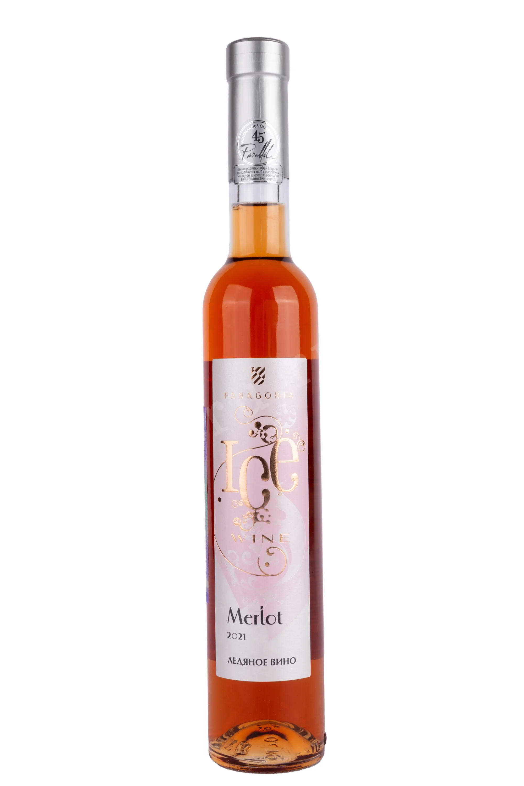 Вино Fanagoria Merlot Ice Wine in tube 2021 0.375 l – это российский розовый сладкий алкоголь, основой которого является виноград сорта Мерло урожая 2021 года. Подмерзшие на лозе ягоды собирают вручную, а после транспортировки дополнительно замораживают до -7 градусов по Цельсию. Затем сырье прессуют, а полученный сок сбраживают в резервуарах из нержавеющей стали. Розлив готового вина был осуществлен в августе 2022 года при крепости 12% и уровне сахара150 г/л. Примечательно, что ледяной напиток выпускается в миниатюрных бутылках объемом 375 мл в комплекте с тубой, выполненной в бело-золотистых тонах.