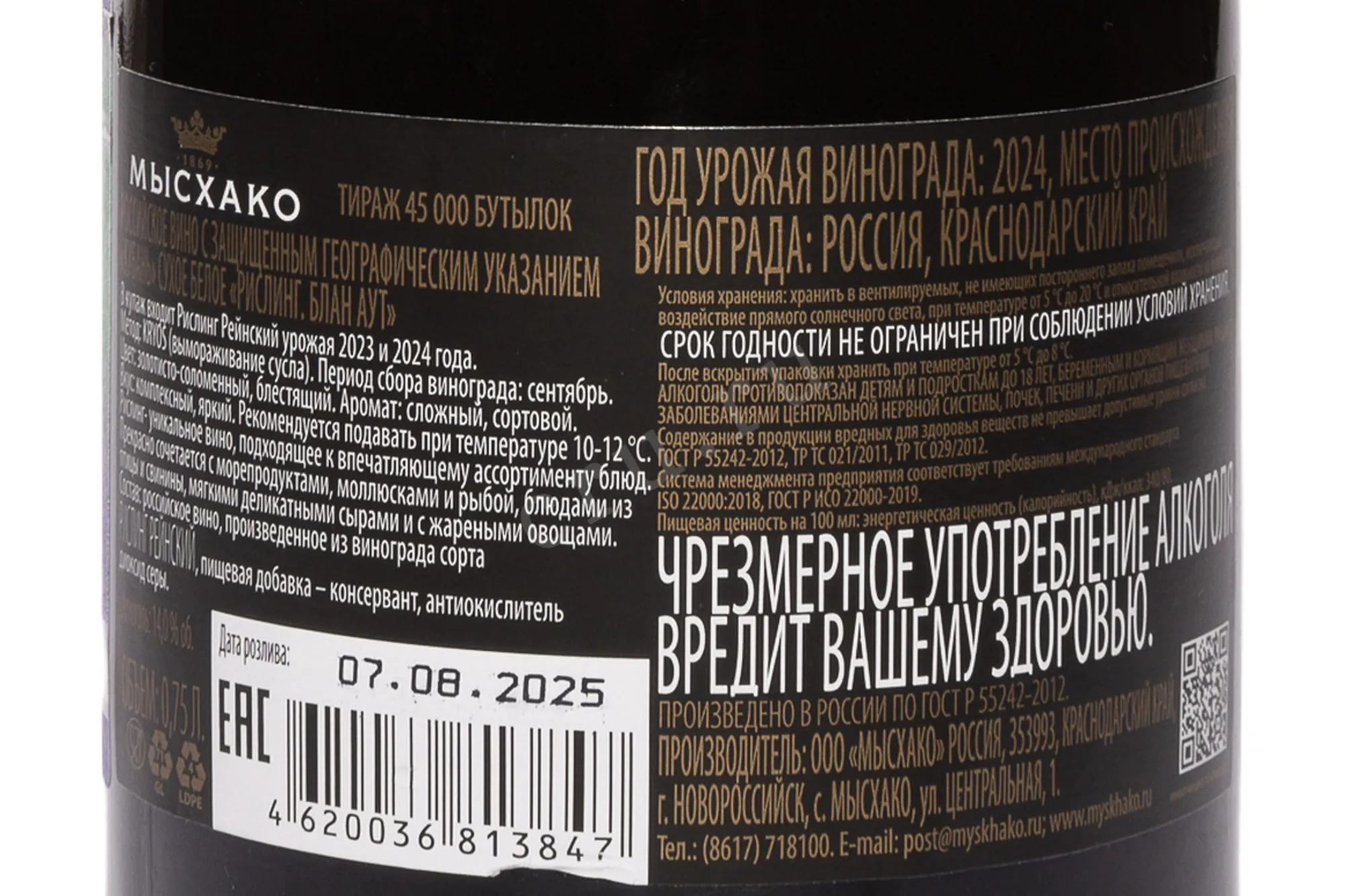 Белое сухое вино Мысхако Крайос Рислинг Блан Аут 2024 года 0,75 л — изысканное, с чистым, свежим и минеральным характером, отражающее потенциал черноморского терруара. Виноград выращен на солнечных склонах Новороссийской долины, где перепады температур между днем и ночью способствуют развитию ароматики и сохранению кислотности. Урожай собирают в сентябре вручную, отбирая только спелые и здоровые ягоды. Основная особенность производства — использование метода KRIOS. Сусло подвергается шоковой заморозке до –4 °C, благодаря чему из него удаляются лишняя вода и винная кислота, а вкус становится концентрированным и чистым. После вымораживания сусло проходит классическую ферментацию при контролируемой температуре, что сохраняет свежесть и сортовые тона.