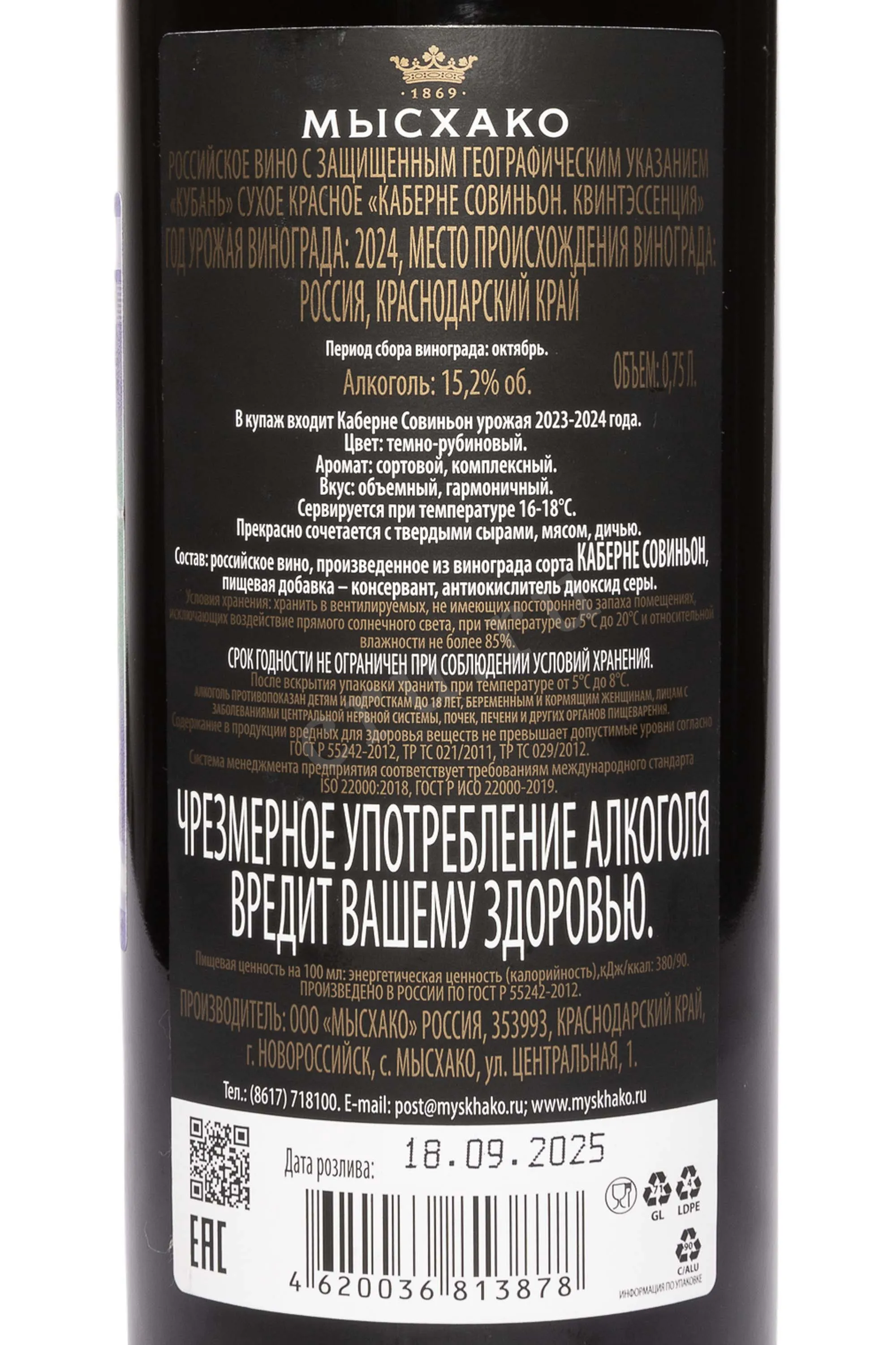 Вино Мысхако Каберне Совиньон Квинтэссенция 0.75 л – российский красный сухой напиток, который является представителем новой линейки Quintessence и производится стараниями лучших виноделов старинной компании Мысхако. Процесс винификации проходит способом «Рипассо» (Ripasso). Урожай высококачественного винограда собирается исключительно после достижения специального уровня зрелости, в регионе Кубань. Элегантное вино поступает в изящной презентабельной бутылке, станет отличным подарком на любое торжественное событие.