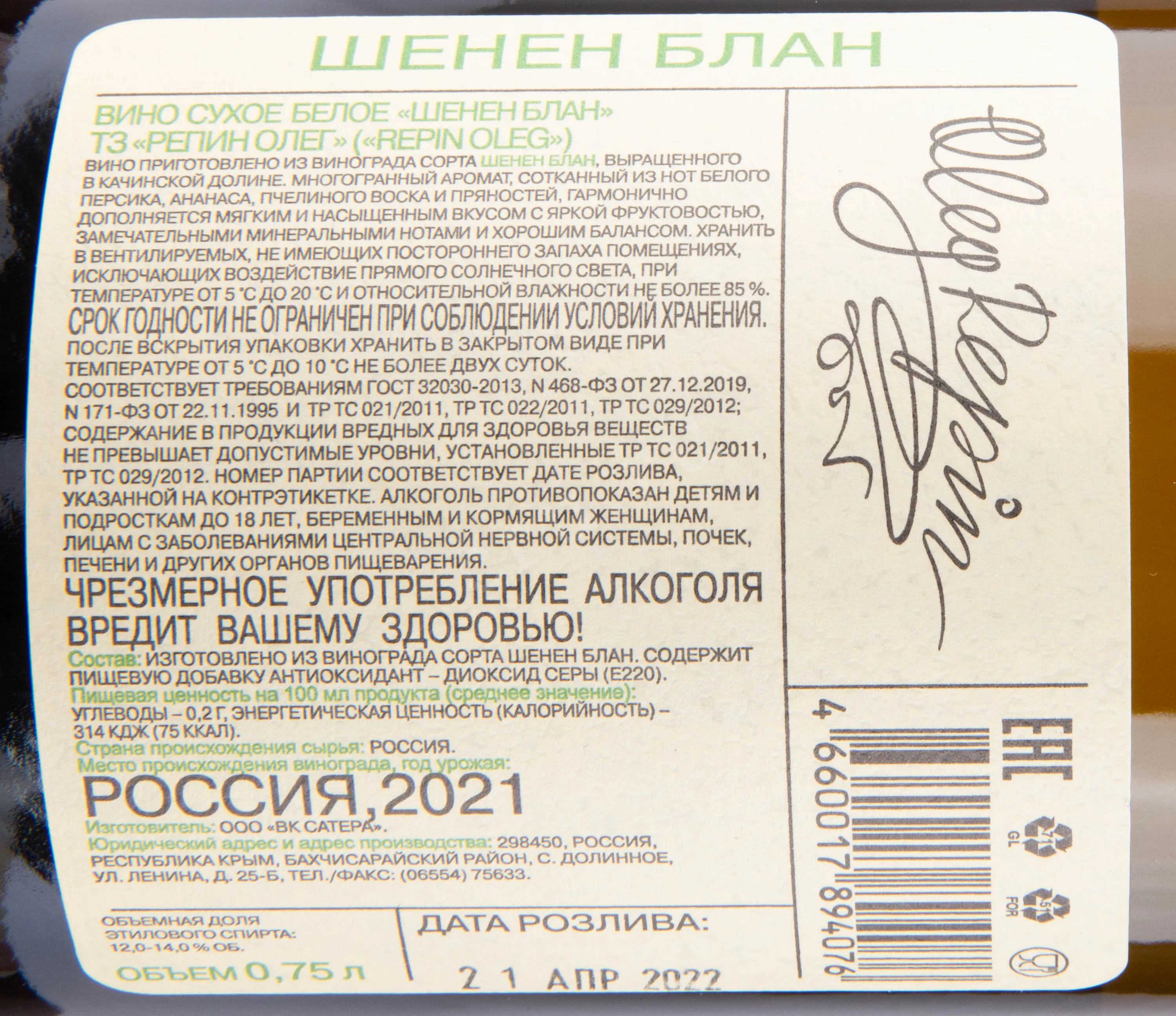 Вино Олег Репин Шенен Блан 0,75 л произведено винодельней ВК Сатера, основанной Олегом Репиным, и отражает подход крафтового виноделия с акцентом на локальный терруар. Сырьё поступает из долины Кача в Крыму — региона с выраженным морским влиянием, известняковыми и глинистыми почвами, которые способствуют формированию баланса кислотности и структуры. Урожай собирается вручную для сохранения целостности ягод. Ферментация проходит при контролируемых температурах в инертных ёмкостях, что позволяет сохранить сортовую чистоту. Часть партии может выдерживаться на тонком дрожжевом осадке, придавая текстуре дополнительную глубину и округлость.