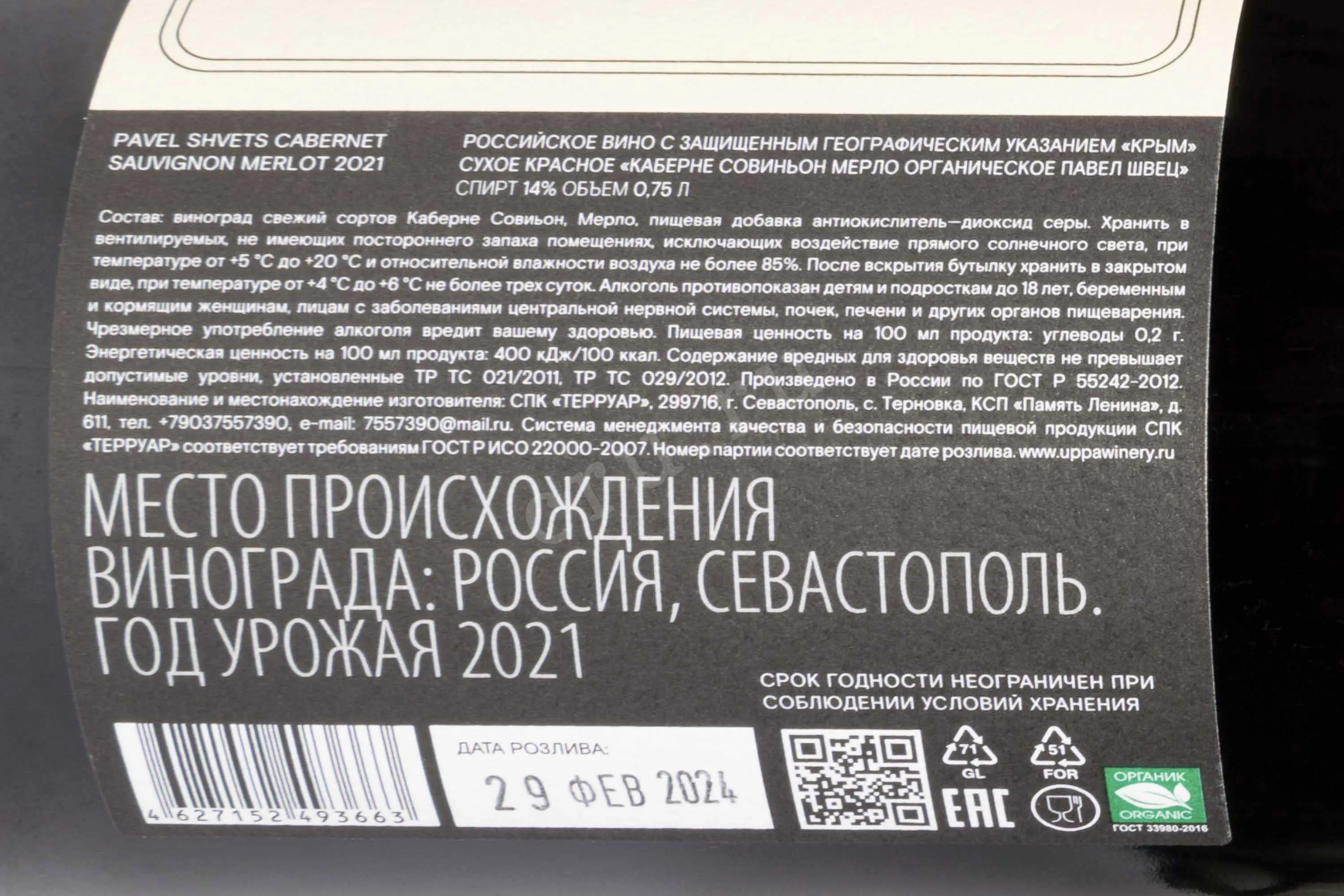 Вино Павел Швец Каберне Совиньон Мерло Долина Реки Черная ЗГУ 2021 0.75 л родилось из гармонии крымского терруара и авторского подхода винодела. Напиток создавался методом ручного сбора урожая с контролем качества каждой грозди. Ягоды произрастали на склонах долины реки Чёрной, где известняковые и глинистые почвы сочетались с мягким морским климатом и прохладными ночами, что обеспечивало баланс кислотности и концентрацию вкуса. Ферментация протекала на диких дрожжах, выдержка происходила в дубовых бочках, благодаря чему напиток обрел выразительную структуру и сложный ароматический профиль. Винодел подчеркнул естественный характер терруара, сохранив чистоту сортов и их уникальное взаимодействие.