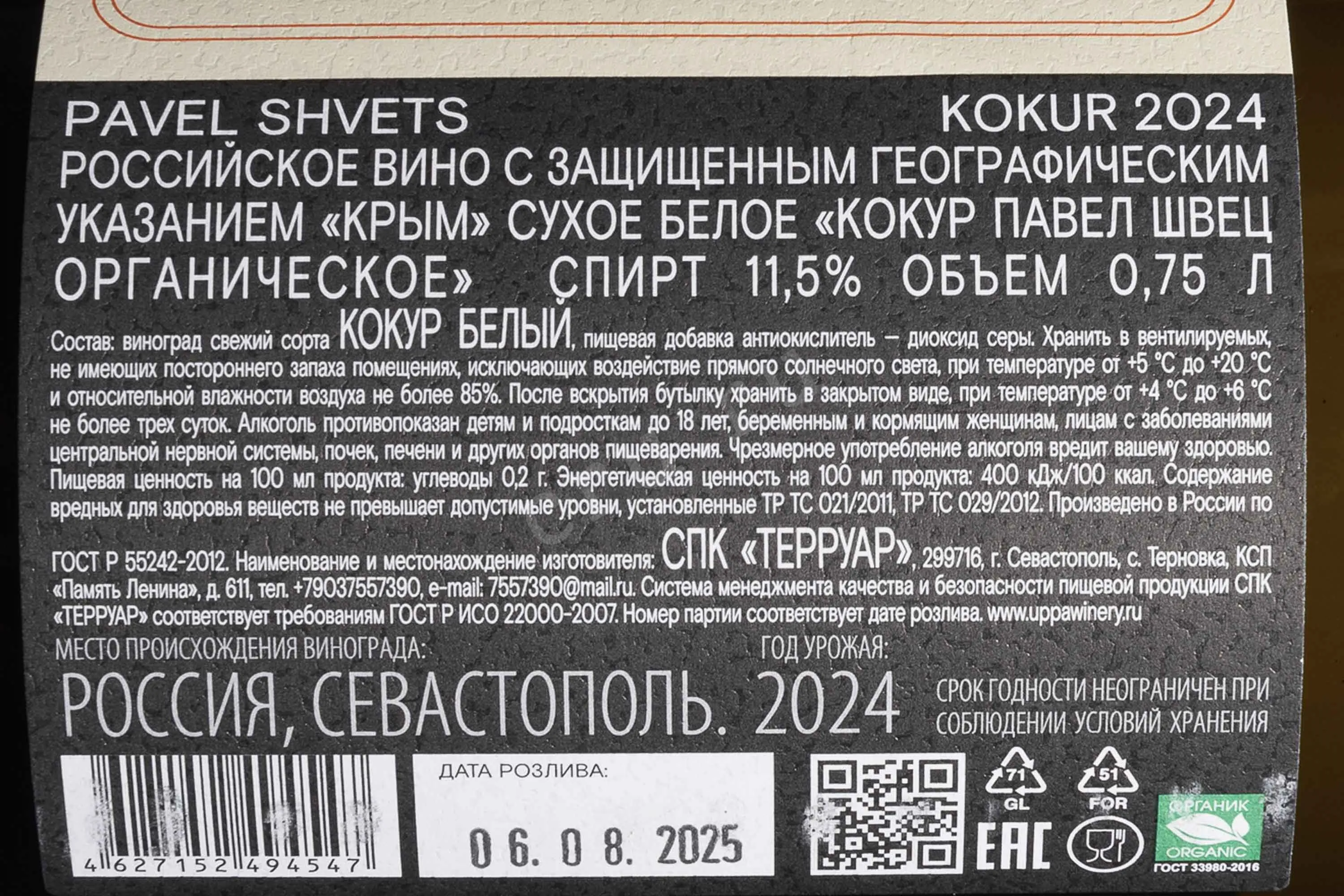 Белое сухое вино Pavel Shvets Kokur Cler Polati Rodnoe Органическое 2024 г. 0,75 л представляет собой авторский взгляд винодела на исторический сорт, который в Крыму формирует особый стиль. Виноградники расположены на участках с каменистой структурой почвы и выраженной солнечной экспозицией. Органический подход исключает химические вмешательства, поэтому ягода созревает естественно и даёт чистый вкус. Урожай собирают вручную. Прессование — мягкое, чтобы сохранить природную свежесть. Ферментация проходит в нейтральной таре, а до розлива напиток несколько месяцев выдерживается на осадке.