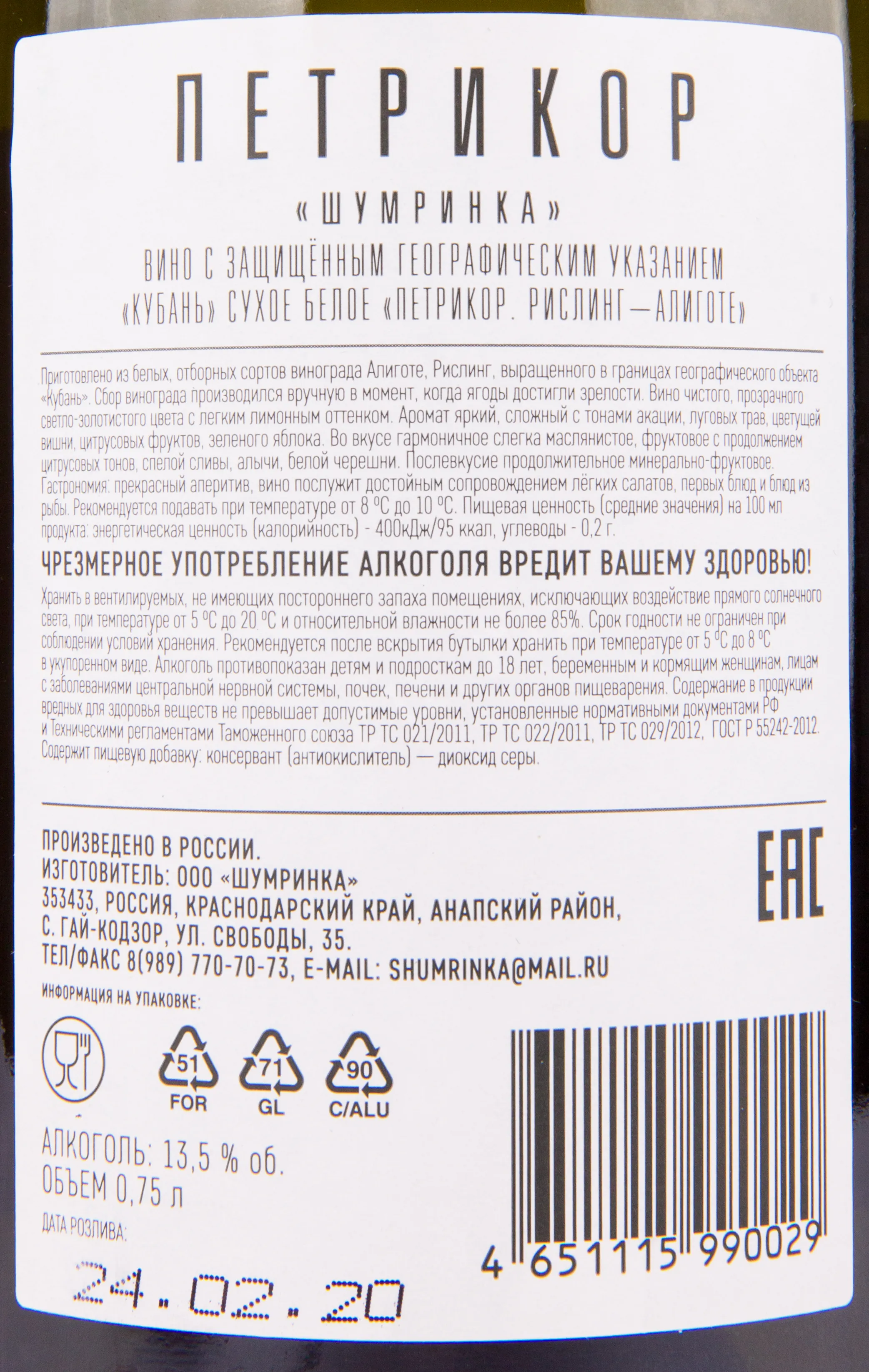 Петрикор Рислинг-Алиготе 2018 0.75 л купить - Российское вино Petrikor Riesling-Aligote цена в магазине КРЮ ПРОФИ г. Москва, ул. Профсоюзная, д. 16/10 10:00-22:00 Ежедневно +7 (495) 920-20-02 info@cru.ru