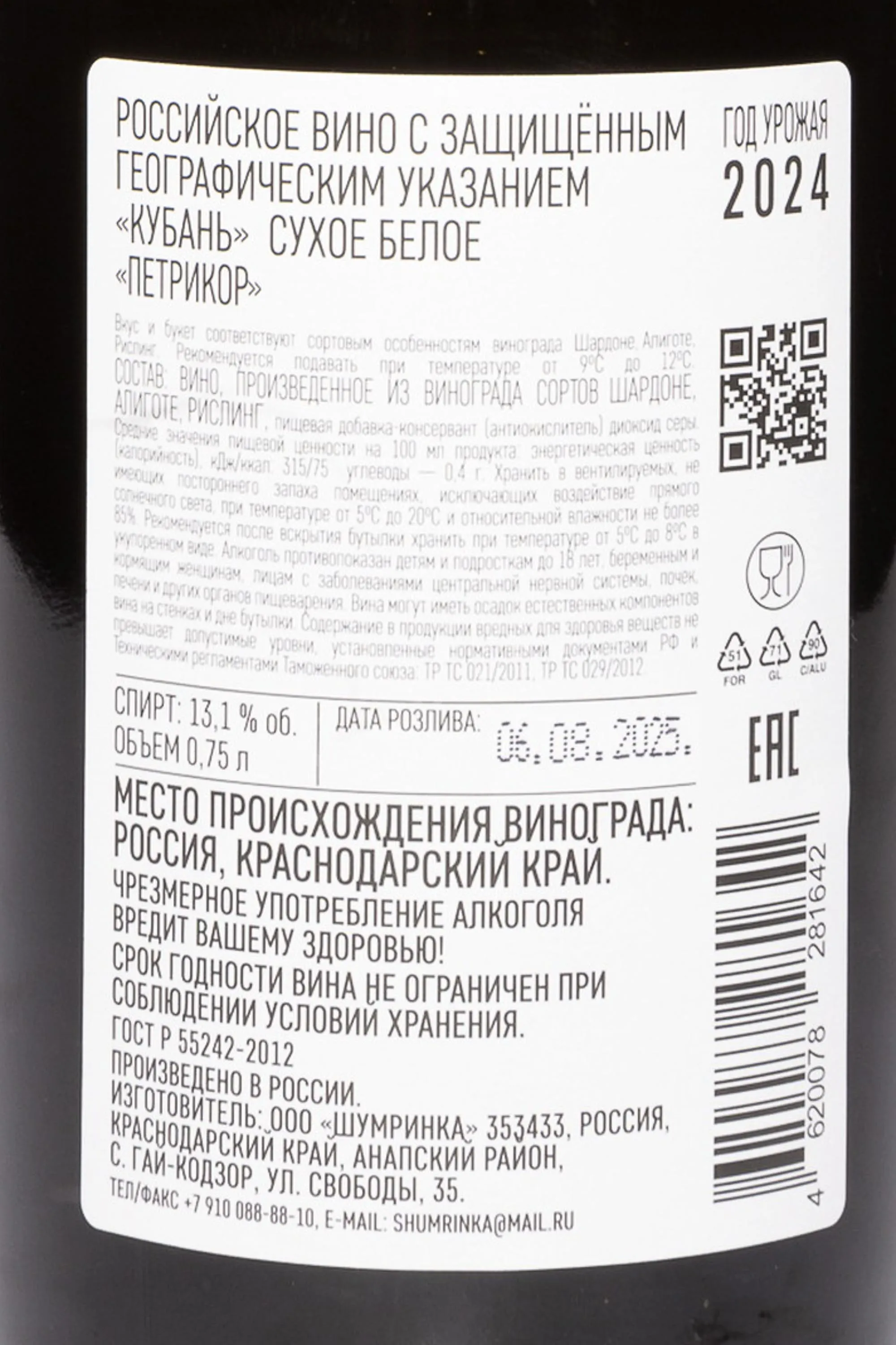 Белое сухое вино Петрикор Белое 2024 г. 0,75 л создано из урожая, собранного в сезон с мягкой весной и солнечным, но не засушливым летом. Осень сезона выдалась сухой с прохладными ночами, что позволило сохранить свежесть кислотности и насытить ягоды ароматическими соединениями. Виноградники расположены на склонах с глинисто-известняковыми почвами, где лозы развиваются медленно и формируют сбалансированный урожай. Сбор проводился вручную, что обеспечило высокое качество гроздей, а отжатый из плодов сок ферментировался в стальных емкостях при низкой температуре. До розлива купаж хранили также в стали.