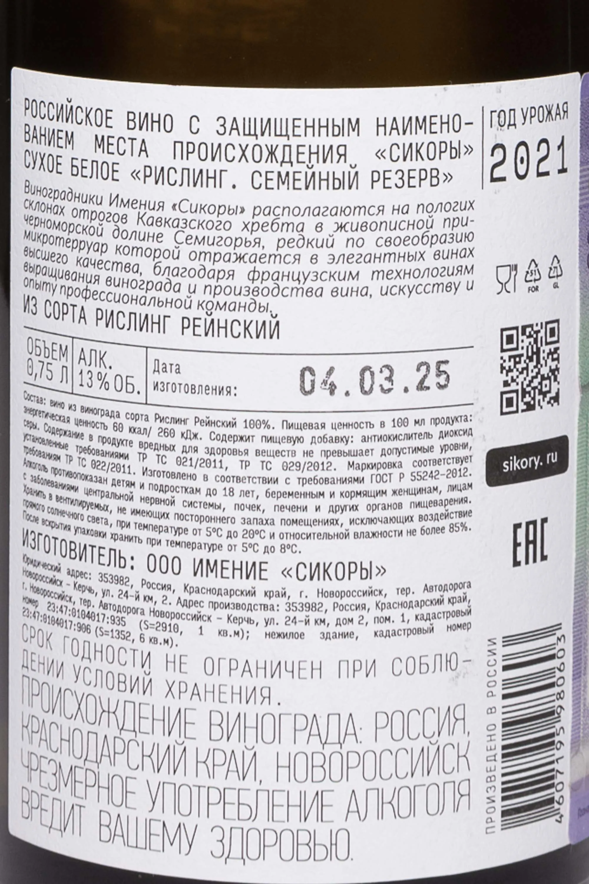 Белое сухое вино Сикоры Рислинг Семейный резерв 2021 года 0,75 л — флагман, отражающий стиль и философию винодельни. Виноград выращивается на виноградниках Семигорья — живописного участка с каменисто-мергелевыми почвами и мягким субтропическим климатом. Лозы Рислинга здесь молодые, около 12 лет, и дают ягоды с высокой ароматической насыщенностью. 2021 года выдался ровным и благоприятным: прохладная весна и умеренно тёплое лето позволили винограду дозреть без потери кислотности. Урожай собирали вручную. Винифицировались грозди целиком без гребнеотделения. Для производства использовался только сок-самотек, который осветлялся при низких температурах и ферментировался в стальных емкостях с точным контролем температуры. Около 15% вина выдерживали во французских дубовых бочках восемь месяцев, остальную часть — на осадке в стали, с регулярным батонажем. После ассамбляжа и фильтрации вино отдыхало в бутылке больше года. Каждая бутылка была запечатана вручную воском и украшена этикеткой с элементами вышивки — символом ремесленного подхода и вдохновения.