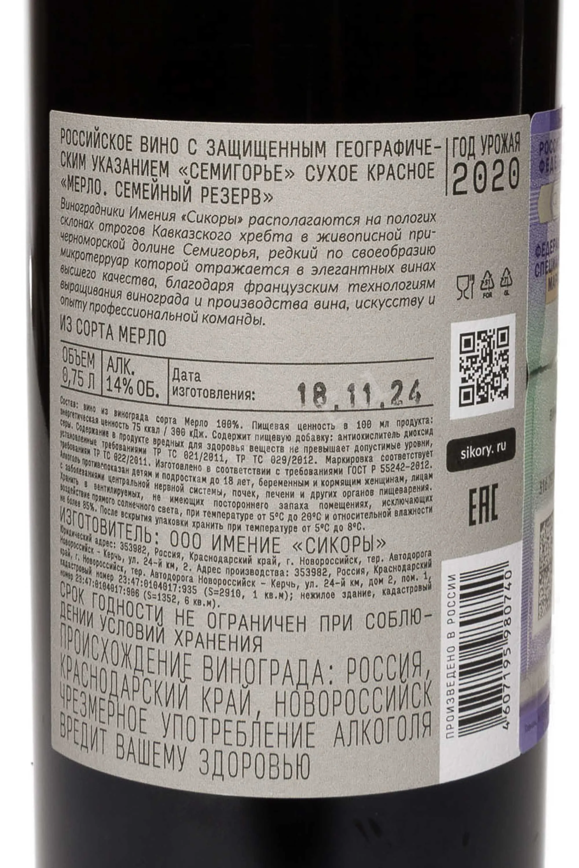 Красное сухое вино Сикоры Мерло Семейный Резерв 2020 года 0,75 л создано в классическом стиле, подчеркивающем характер сорта и терруара. Виноградники хозяйства расположены между Новороссийском и Анапой, на живописных склонах с каменисто-мергелевыми почвами, в зоне с мягком субтропическим климатом. Урожай собирают вручную, что позволяет сохранить целостность каждой грозди. В 2020 году погода способствовала равномерному созреванию ягод и дала виноделам сырье с отличным балансом. После гребнеотделения проводили холодную мацерацию при 12-14 °C, затем сусло ферментировали на мезге при 26 °C в течение 18 дней. Часть вина выдерживали в бетонных емкостях, часть — во французских дубовых бочках средней обжарки 14 месяцев. Линейка Семейный Резерв отличается строгим отбором винограда и высоким качеством. Каждая бутылка запечатана вручную воском, что подчеркивает индивидуальность и премиальный уровень вина.