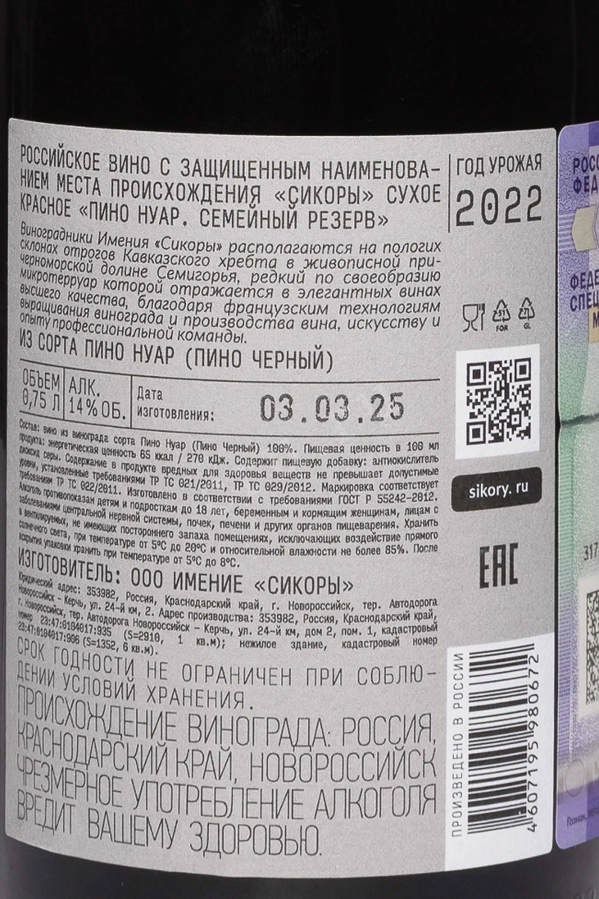 Красное сухое вино Сикоры Семейный Резерв Пино Нуар Семигорье 2022 года 0,75 л создано в Краснодарском крае, между Новороссийском и Анапой, где мягкий субтропический климат и каменисто-мергелевые почвы формируют тонкий и благородный стиль вина. 2022 год стал для региона благоприятным: солнечные дни и умеренные осадки позволили ягодам равномерно вызреть, сохранив свежесть и аромат. Виноград собирают вручную с ухоженных склонов в имении Сикоры. После гребнеотделения проводится холодная мацерация при 14 °C, что помогает сохранить ароматические соединения. Ферментация проходит на мезге при 26 °C около 18 дней. Далее часть вина выдерживается в нержавеющих емкостях, а часть — во французских дубовых бочках средней обжарки в течение 8 месяцев. После розлива напиток дозревает еще 1,5 года в подвалах. Каждая бутылка запечатана вручную воском и украшена этикеткой с узором, вдохновленным народной вышивкой — символом мастерства и уважения к традициям.