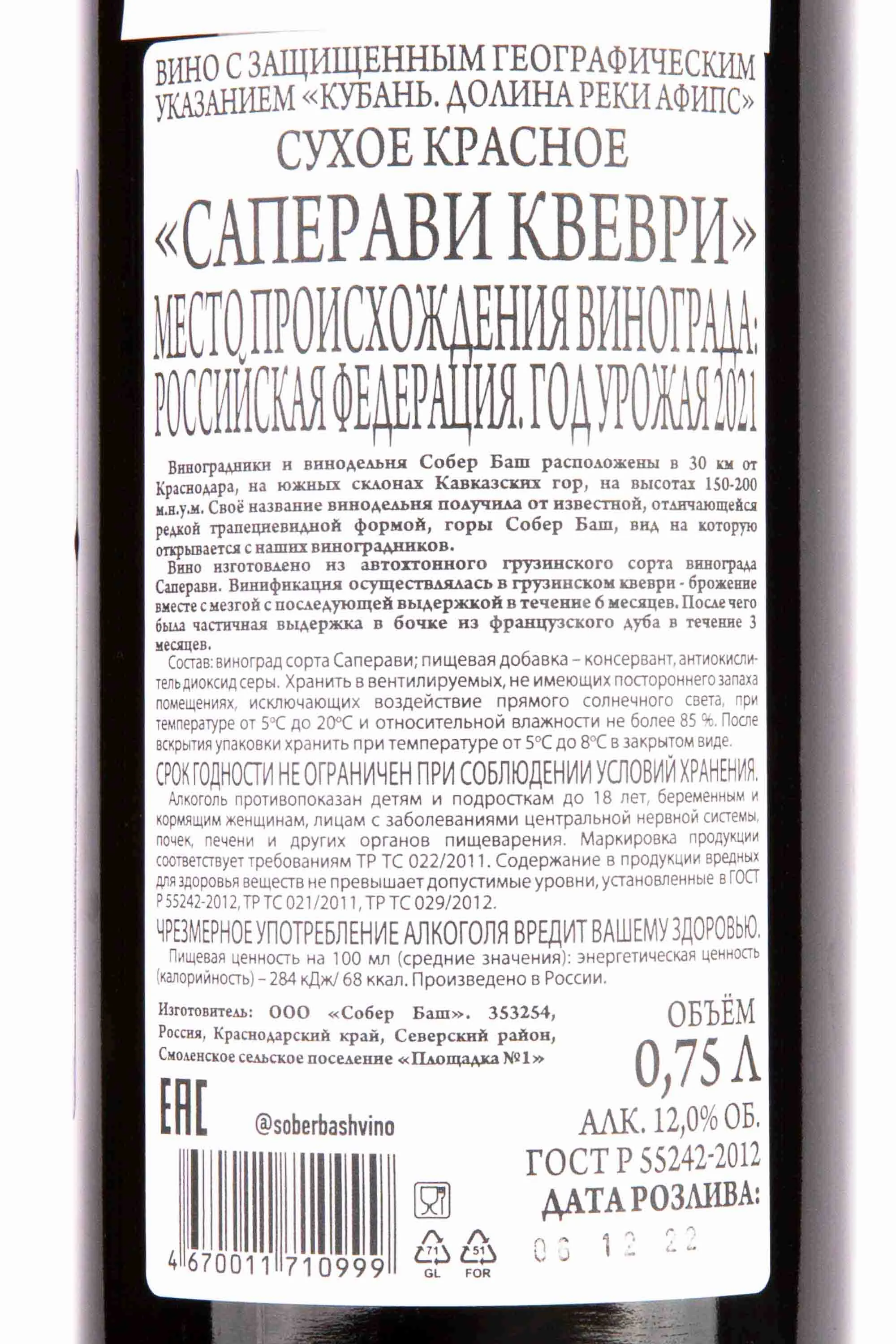 Вино Собер Баш Грани Саперави Квеври 2021 0.75 л