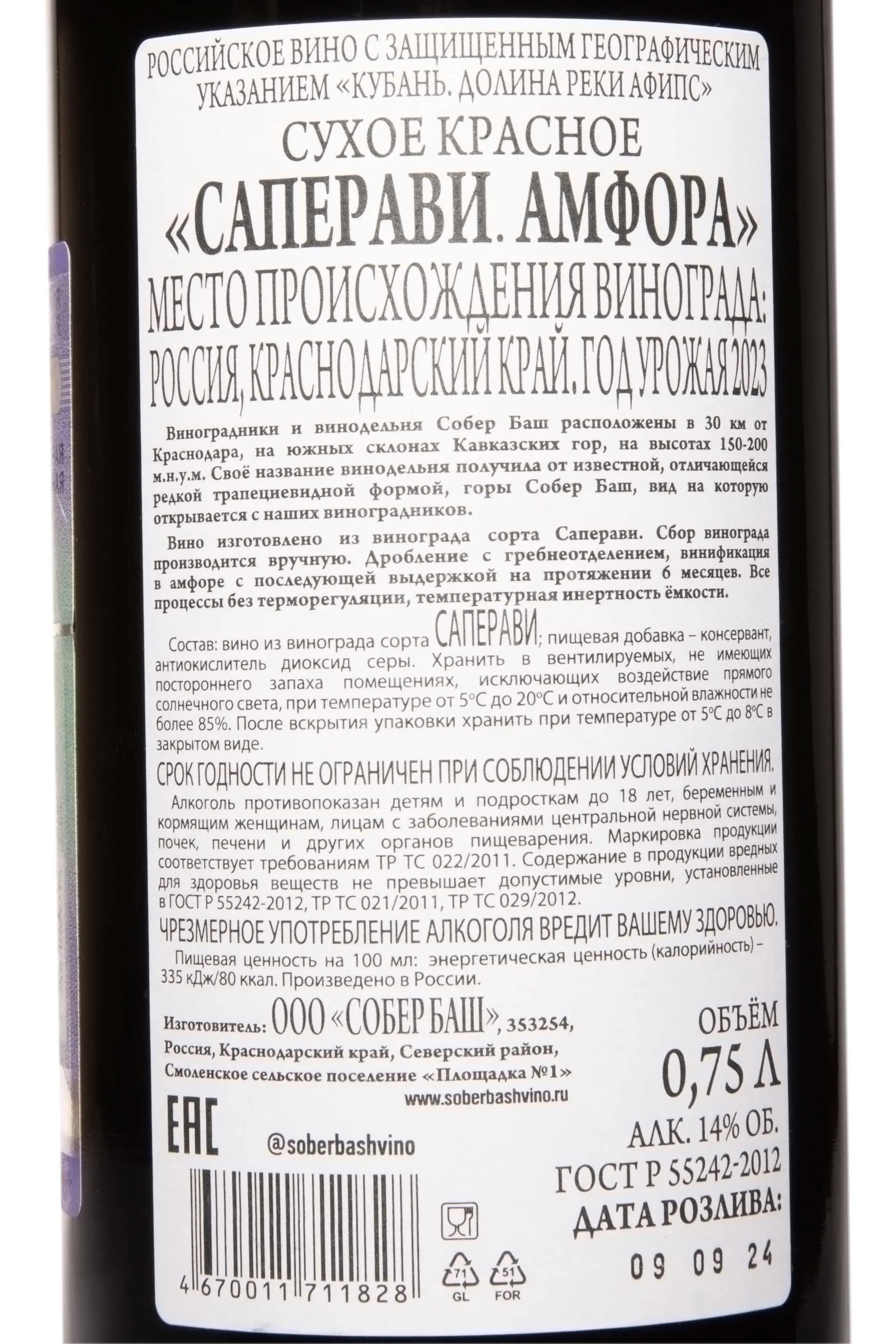 Собер Баш Саперави Амфора 2023 0.75 л купить - Российское вино Sober Bash Saperavi Amphora цена в магазине КРЮ ПРОФИ г. Москва, ул. Профсоюзная, д. 16/10 10:00-22:00 Ежедневно +7 (495) 920-20-02 info@cru.ru