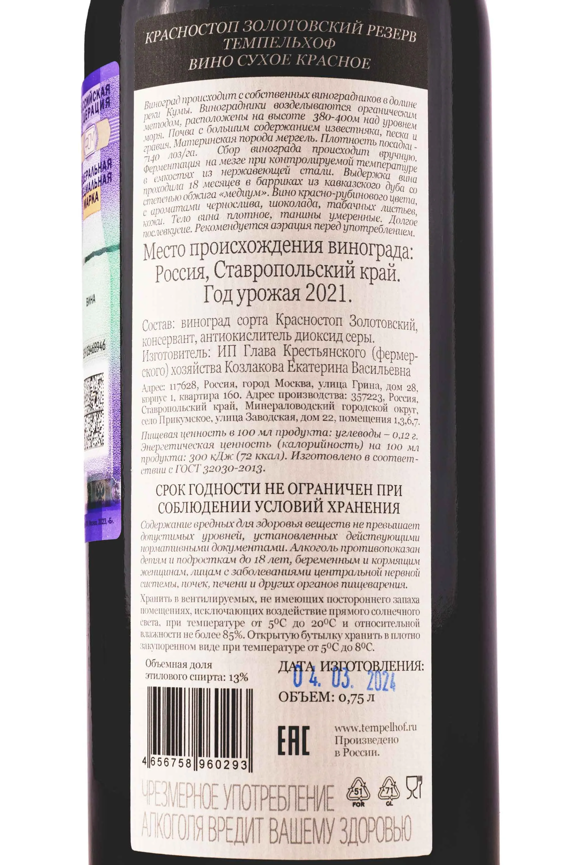 Темпельхоф Красностоп Золотовский Резерв 2021 0.75 л купить - Российское вино Tempelhof Krasnostop Reserv Zolotovsky цена в магазине КРЮ ПРОФИ г. Москва, ул. Профсоюзная, д. 16/10 10:00-22:00 Ежедневно +7 (495) 920-20-02 info@cru.ru