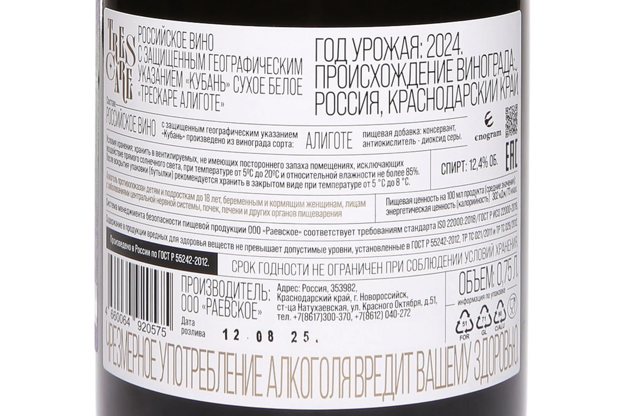Белое сухое вино Трескаре Алиготе 2024 года 0,75 л создано в свежем и гармоничном стиле. Виноград выращен на Кубани, под Новороссийском, в станице Натухаевская. Благодаря влиянию умеренного климата и прохладным ночам ягоды сохранили хорошую кислотность. 2024 год оказался удачным: весна была мягкой, лето без сильной жары, а осень подарила оптимальные условия для созревания сорта Алиготе. Ферментация протекала 10 дней в стальных резервуарах при контролируемой температуре не выше 16 градусов, что позволило сохранить естественную фруктовость и чистоту вкуса. Выдержка на осадке длилась около полугода, частично в стали, частично (20%) в трехлетних дубовых барриках.