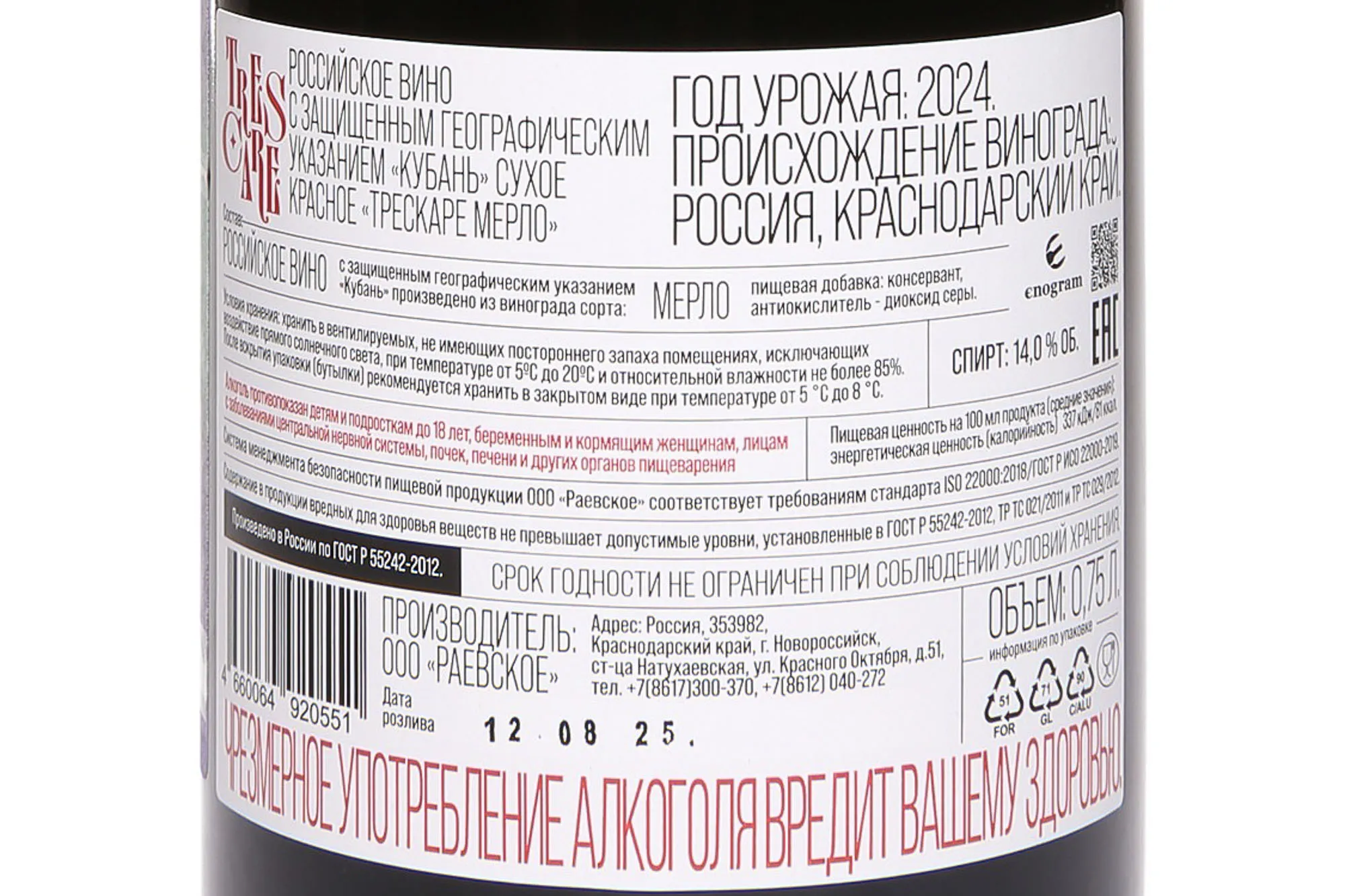Красное сухое вино Трескаре Мерло 2024 года 0,75 л создано в современном стиле, для которого характерно сочетание изысканных сортовых оттенков и яркой фруктовости. Виноград выращивался в зоне умеренного климата, в Краснодарском крае, в станице Натухаевская. 2024 год был благоприятным: теплая весна, жаркое лето и сухая осень позволили винограду полностью вызреть. Урожай собирали ручным способом, проверяя качество каждой грозди. Ферментация проходила в стальных емкостях 50%) и больших дубовых чанах (50%) при контролируемой температуре (26-28 градусов), что сохранило чистоту вкуса. Проводилась постферментация (3 недели). Выдержка протекала 6 месяцев, половина вина созревала в дубовых чанах на 6000 л, половина — в 3-летних барриках. Это российское Мерло выделяется своей сбалансированной структурой и уже получило положительные отзывы на локальных дегустациях.