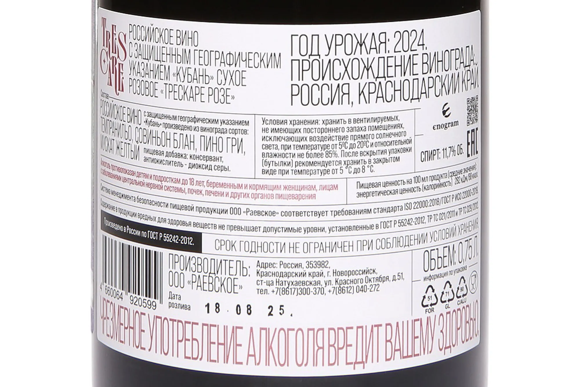 Розовое сухое вино Трескаре Розе 2024 года 0,75 л рождено на Кубани, где климат мягкий и солнечный, а почвы богаты минералами. Урожай 2024 года оказался удачным: лето было теплым и сухим, что позволило ягодам набрать оптимальный баланс сахара и кислотности. Виноград собирали вручную в период полной зрелости. Проводилась холодная мацерация (6-8 часов) отдельно для каждого из сортов, входящих в купаж. Ферментация протекала 2 недели в стальных резервуарах при температуре не выше 15 градусов, что помогло сохранить свежесть и чистоту вкуса. Выдержка была короткой, что позволило подчеркнуть легкость и выразительность вина.