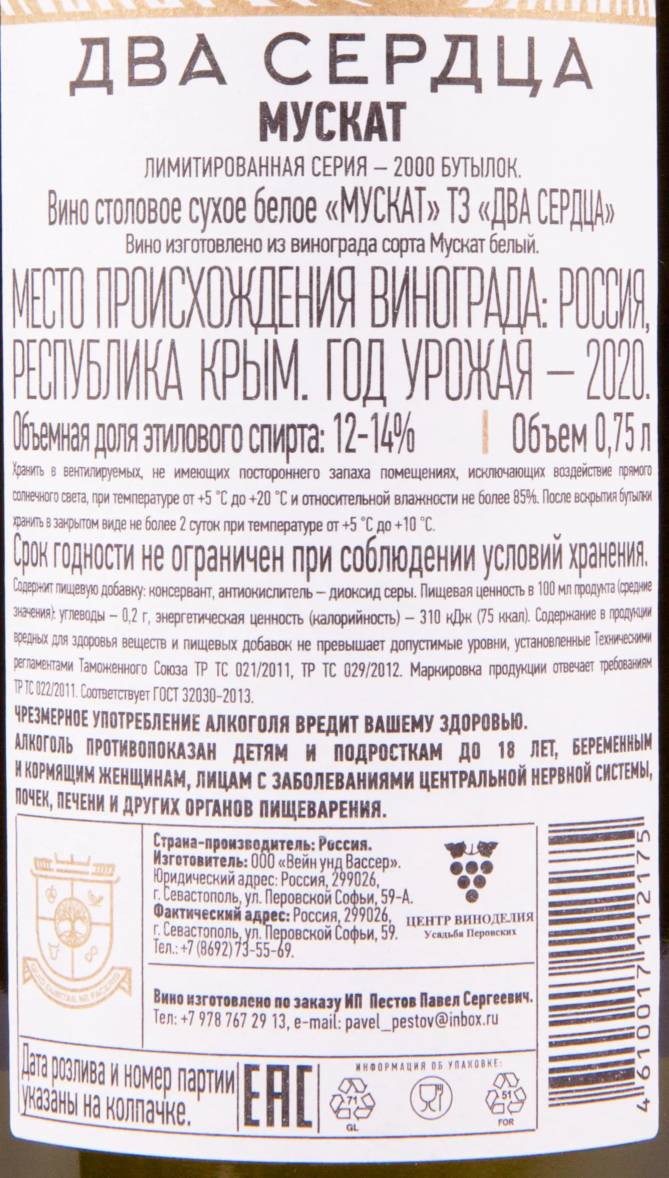 Два Сердца Мускат 2021 0.75 л купить - Российское вино Two Hearts Muscat цена в магазине КРЮ ПРОФИ г. Москва, ул. Профсоюзная, д. 16/10 10:00-22:00 Ежедневно +7 (495) 920-20-02 info@cru.ru
